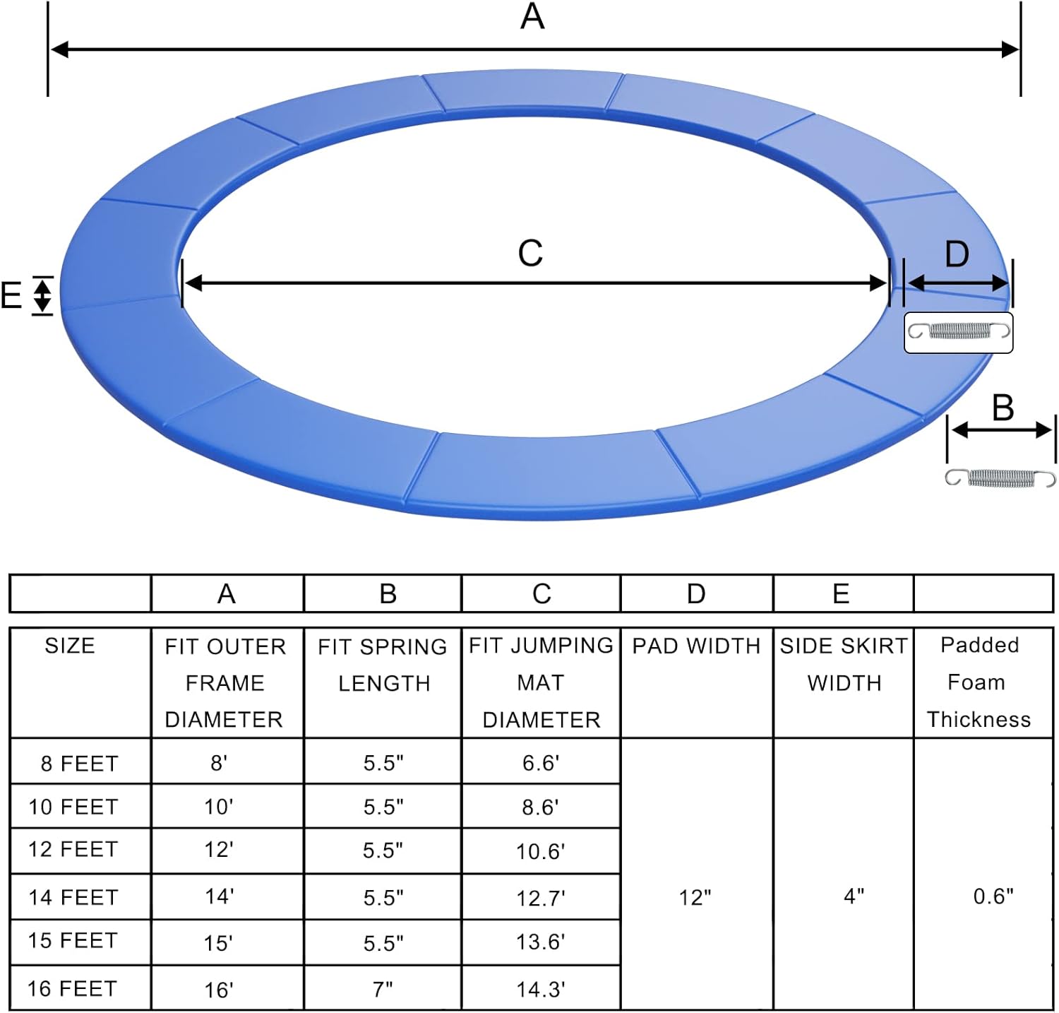 - [ Easy to Assemble & Replace ] Our 16 Ft trampoline safety pad has a folding design, which helps to reduce a lot of tedious assembly steps. All you need to do is lay it flat on the trampoline and fix the 36 elastic ropes. The simple replacement process will not waste your too much time and energy.
