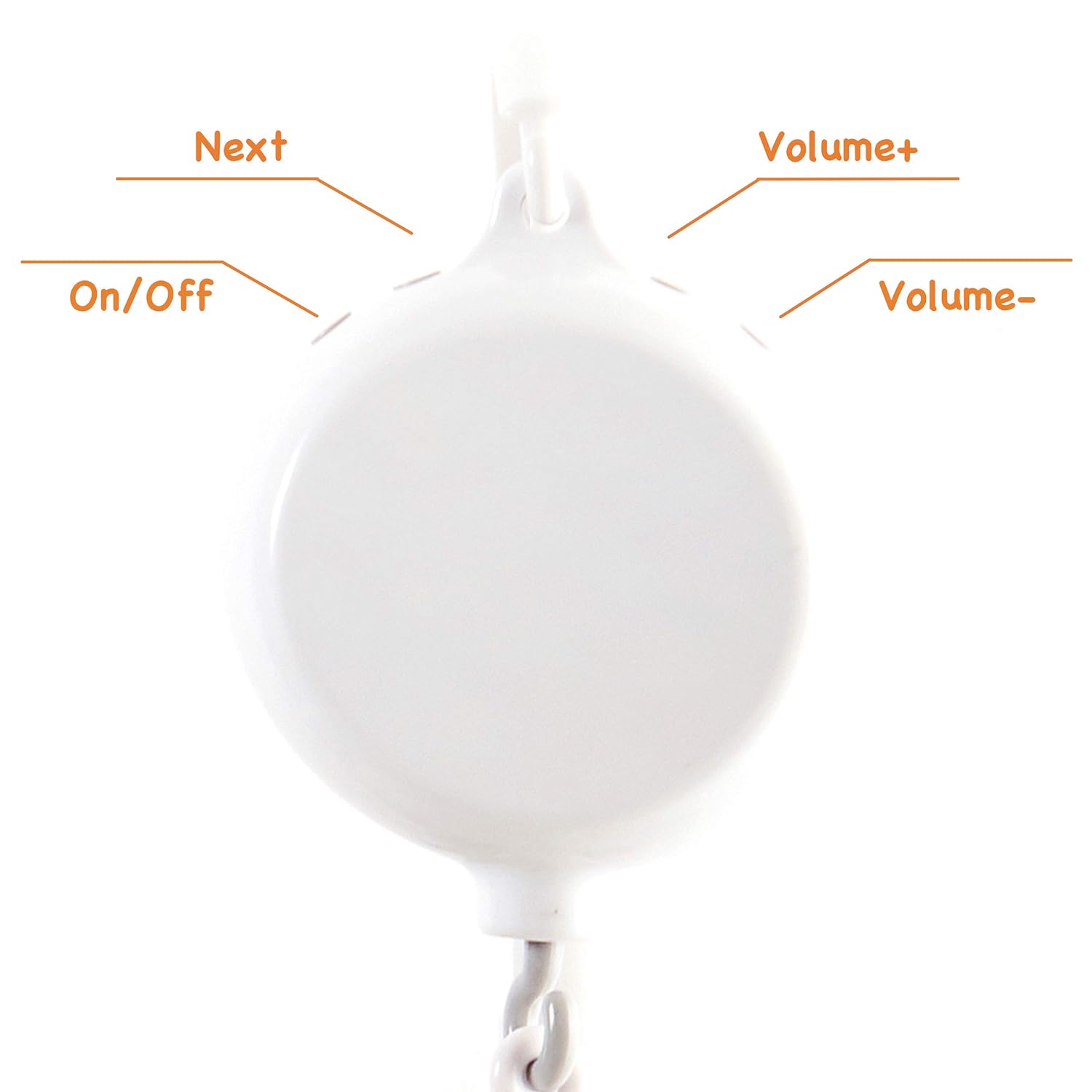 - Woodland animals spinning gently to 12 different melodies with on/off switch and volume control help to soothe babies to sleep