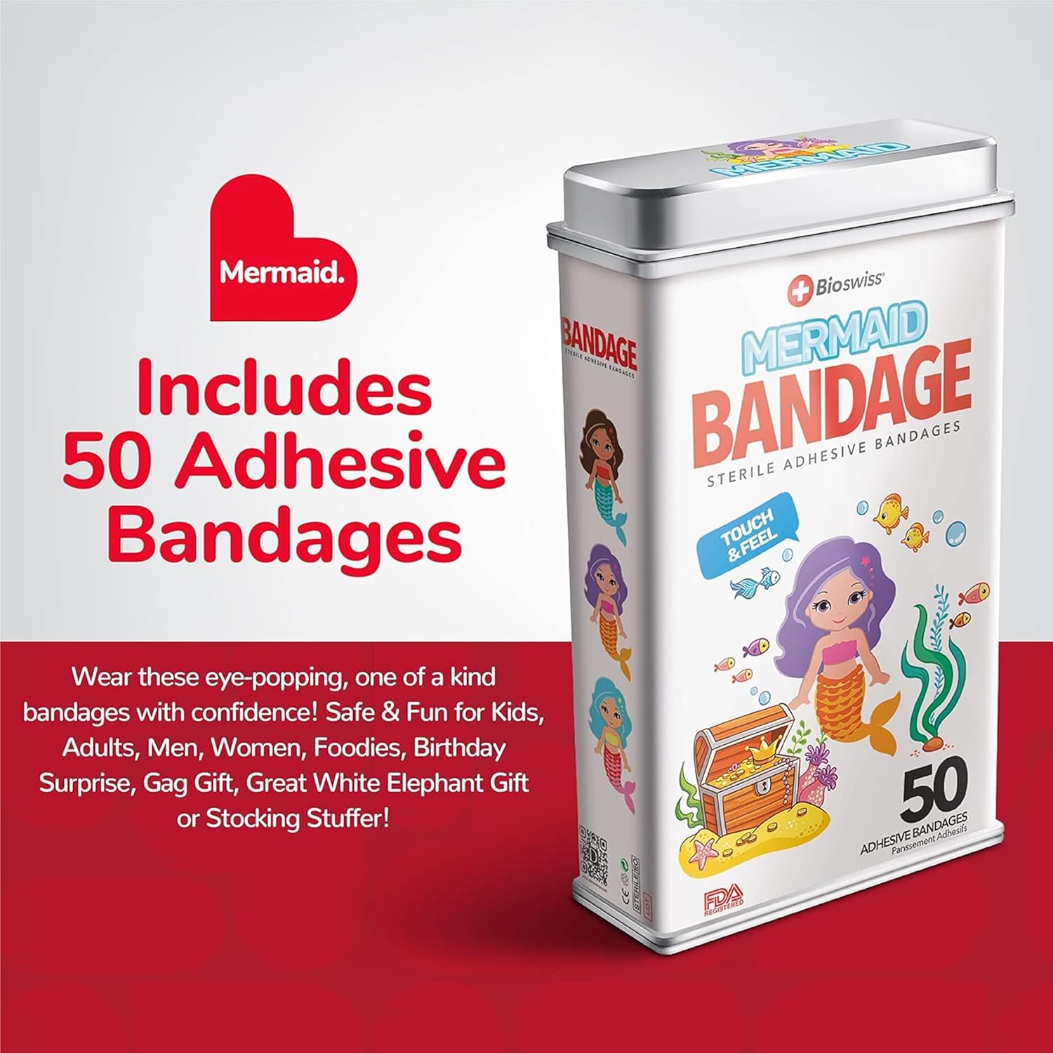 - MERMAID BANDAGES: This 50 piece tin of funny mermaid bandages is great for putting a smile on kids' faces while protecting wounds such as cuts, scrapes, and burns, and come in 3 assorted colors; sticky bandages are perfect for kids and adults alike, and also for school nurses and pediatric doctors