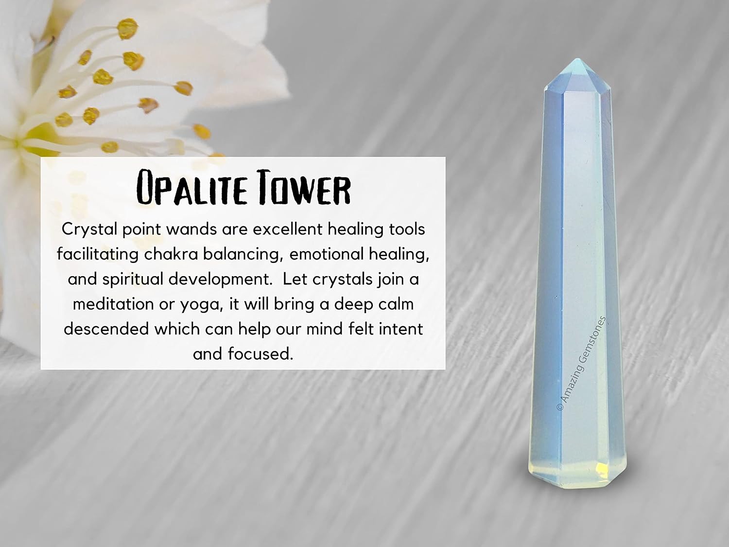 - Opalite Crystal Tower will uplift and purify the energy (if its point is not damaged), so you can place it in any area that needs to be re-energized with strong energy. Length of this tower / wand / obelisk / point is 2" inch to 3" inch (5cm to 7.5cm) & width is 0.75 inch (2 cm).