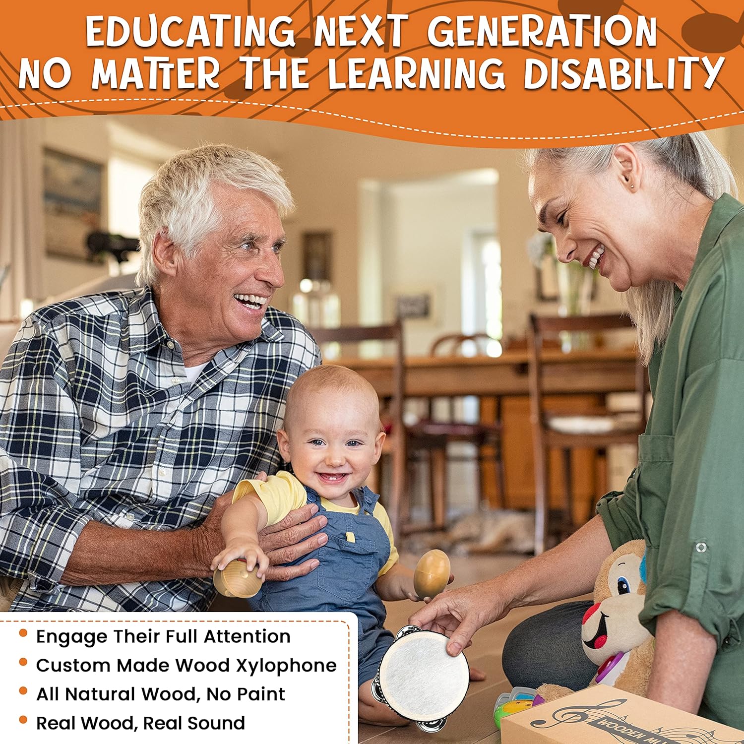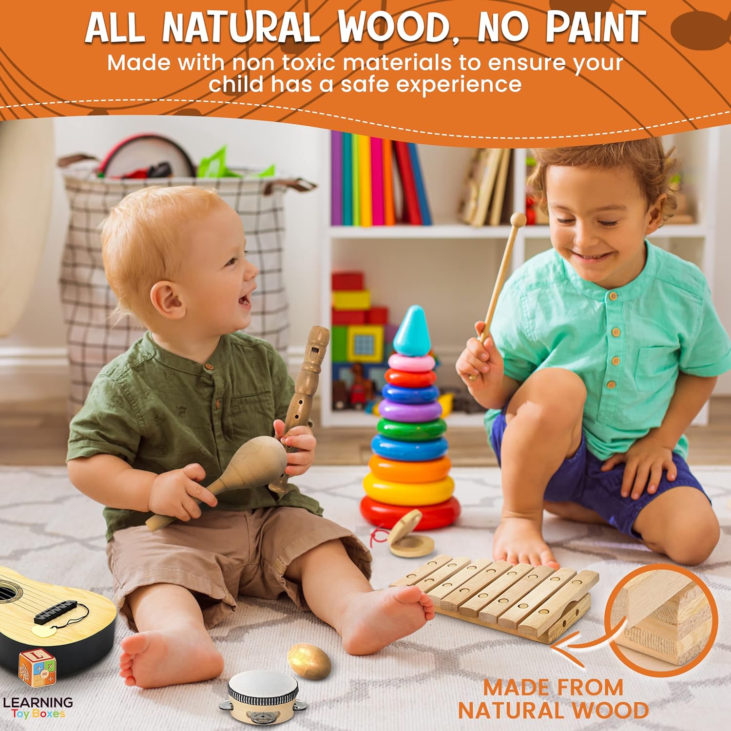 - ★【Educate Next Generation No Matter The Learning Disability】Our premium wooden musical instruments for toddlers 1-3 grades is made for every child and encourage rhythm and music sense in children of different ages. Includes: 1 Xylophone for toddlers 1-3 Set 1 Tambourine 1 Castanets 1 Egg Shaker 1 Recorder 1 Maracas and 1 Untuned Mini toddler guitar.