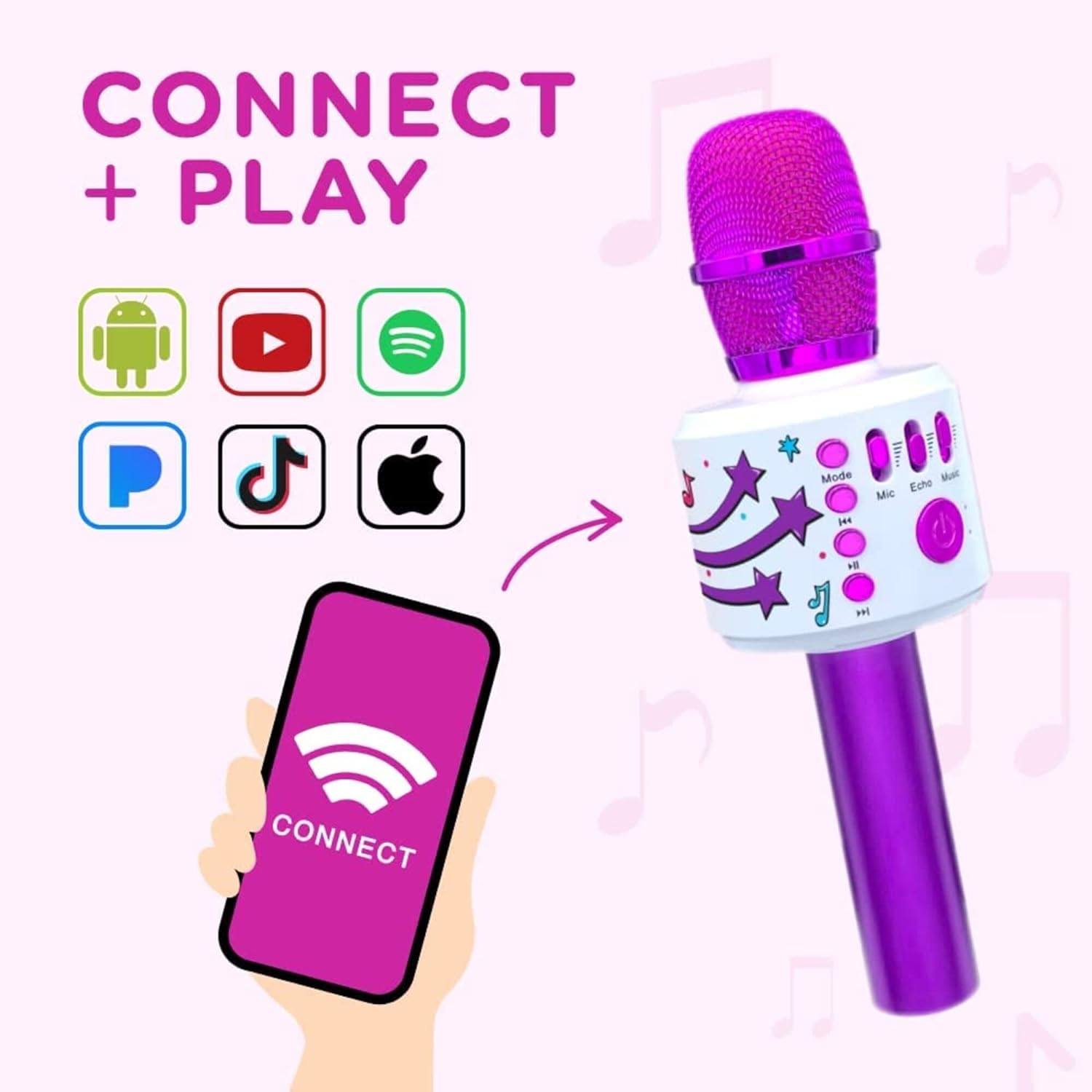 - PLAY ANY SONG – Bluetooth connection allows kids to sing along to any song. Functions as a Bluetooth speaker, so connect to kid’s favorite music app like Spotify, Apple Music, or YouTube