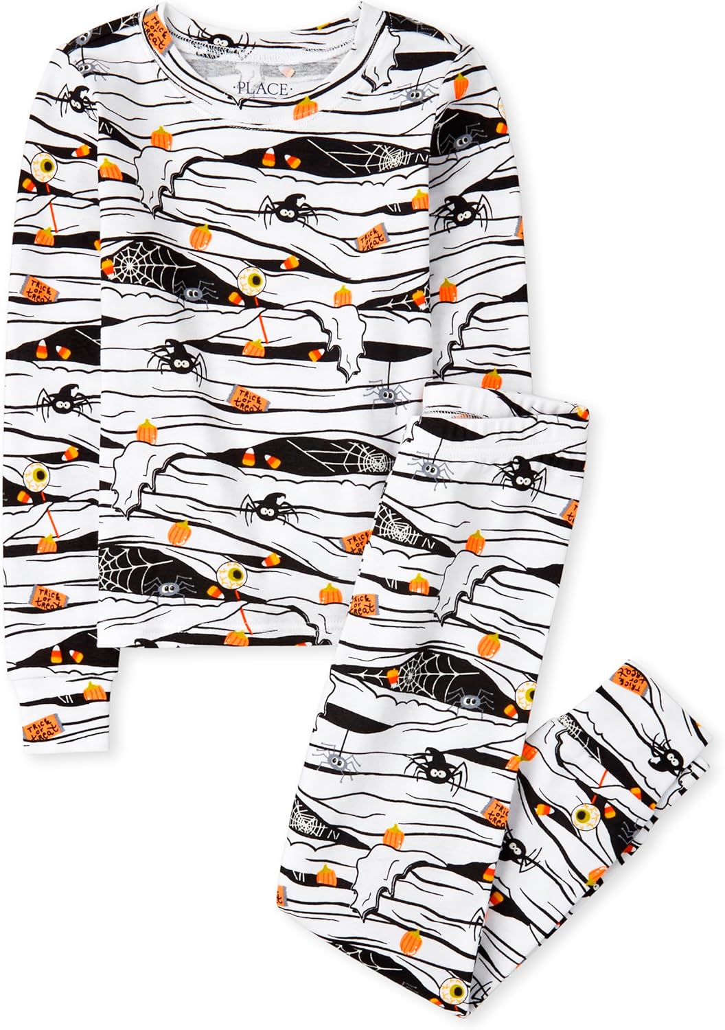 • Top features allover mummy and candy print that glows in the dark; styled with rib-knit crew neck and banded sleeve cuffs