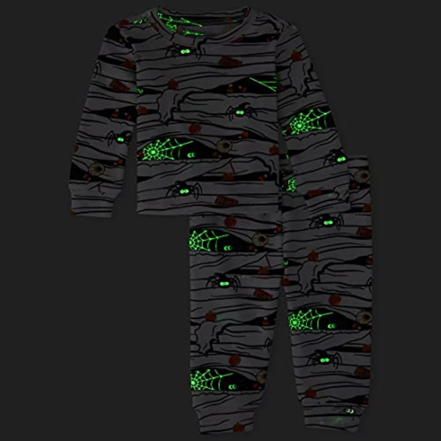 • Pants have allover mummy and candy print that glows in the dark; styled with pull-on elasticized waistband and rib-knit banded leg cuffs