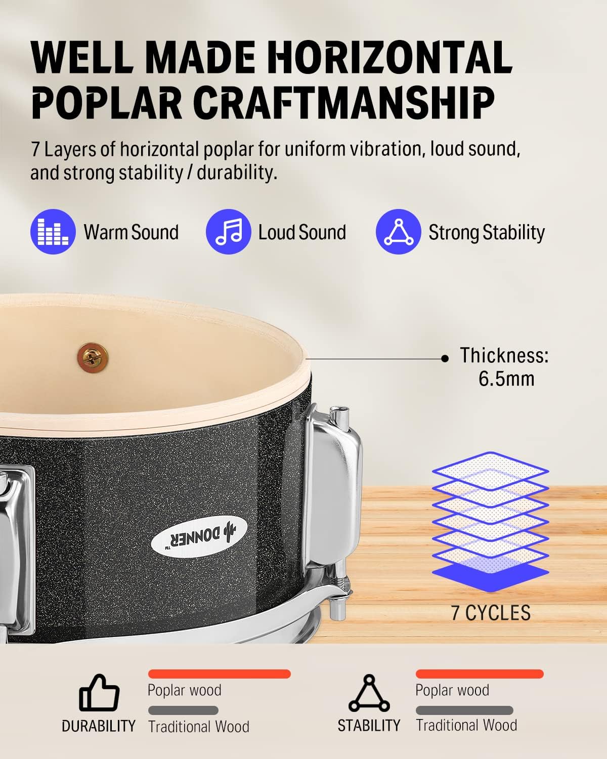 - [High Quality] The drum shell is made of horizontal-grained poplar wood, with high strength, uniform vibration and loud sound. It adopts a 6-ear structure, which has greater skin tension and better skin vibration than similar products. The bass drum is made of high-quality silver rims with coated brackets