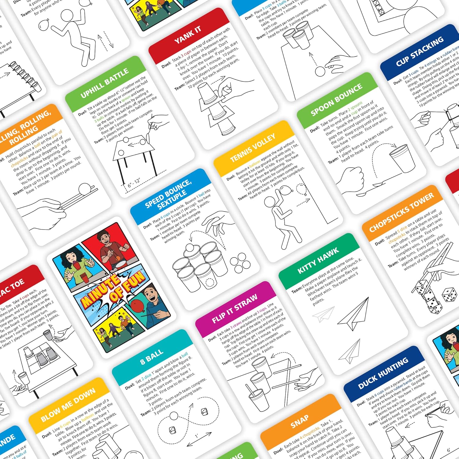 - PERFECT FOR ANY GATHERING: From "Chopsticks Tower", stacking dice with chopsticks, to "Rapid Fire," knocking down a cup tower with rubber bands, Minute of Fun is perfect for road trip activities, yard games, or at home date nights. Take it to school events, family gatherings, or dorms. Great addition to any birthday party or family game night. Take it with you on road trips, camping or family holidays for hours of fun indoor rain or outdoor sunshine fun.