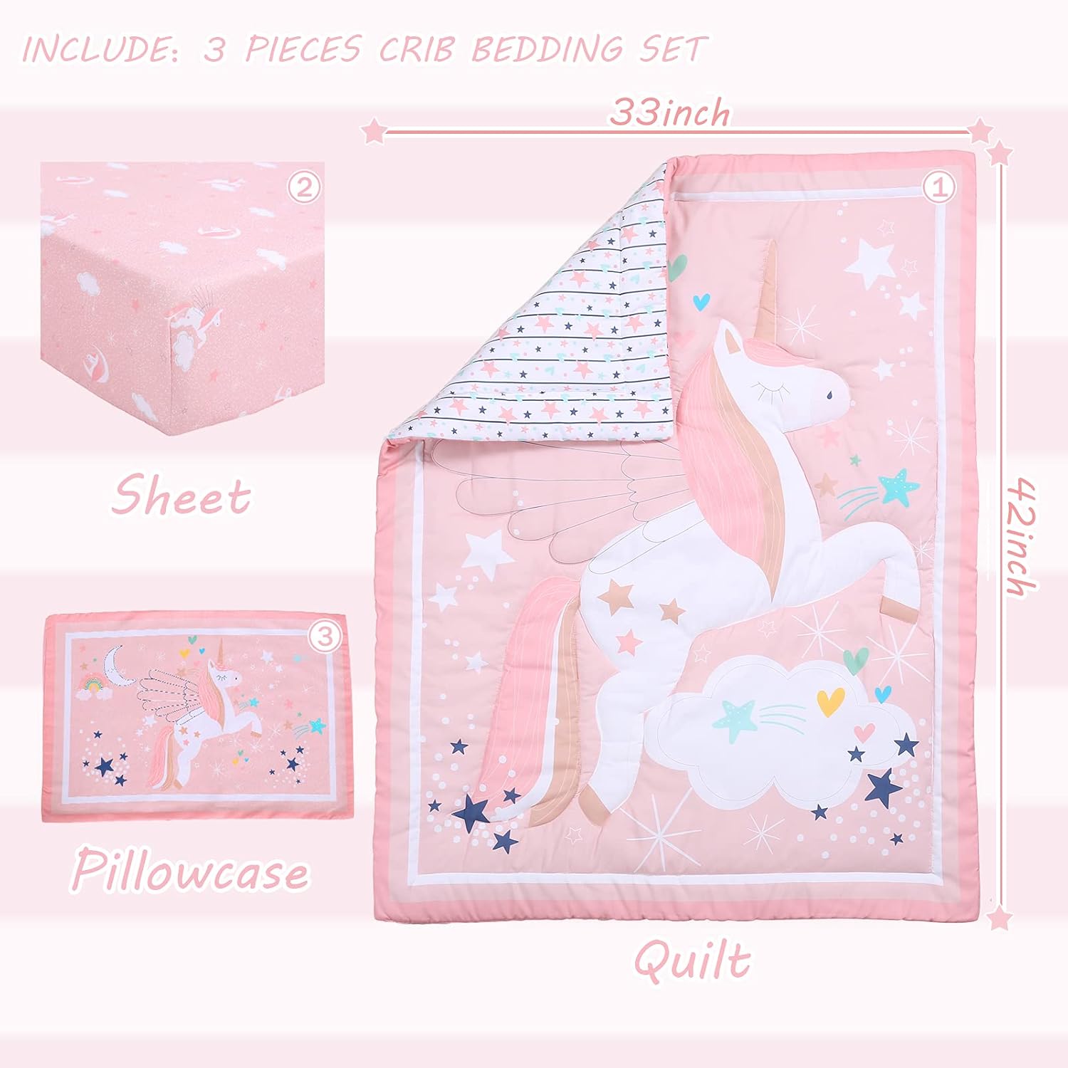 - [PERFECT FIT CRIB BED] - This Unicorns crib sheet set for girls fits a standard size crib bed.The pillowcase fitted 13x18 Inch toddler pillow,the crib sheet fitted 52x28 Inch crib Mattress,and there is also a 33x42 Inch crib quilt in the bed set.