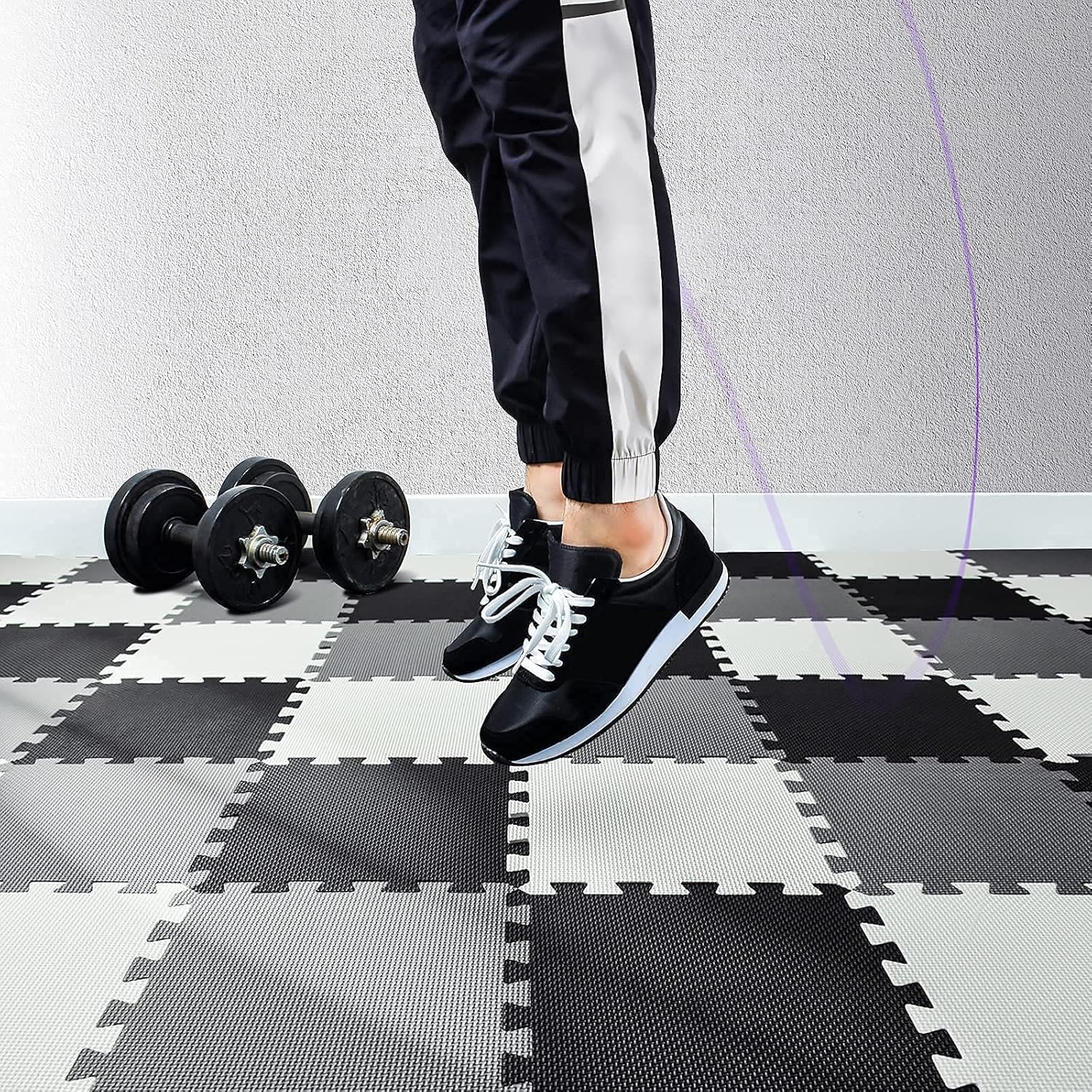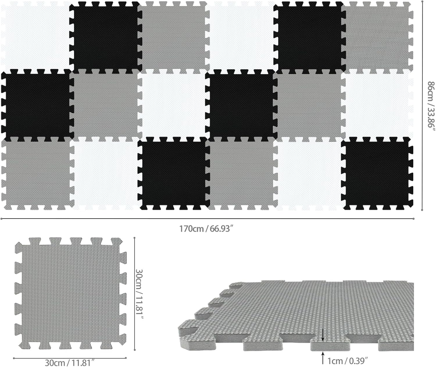 qqpp EVA Rubber 18 Tiles Interlocking Puzzle Foam Floor Mats - Baby Play Mat for Playing | Exercise Mat for Home Workout. White, Black, Gray. QC-ADLb18N