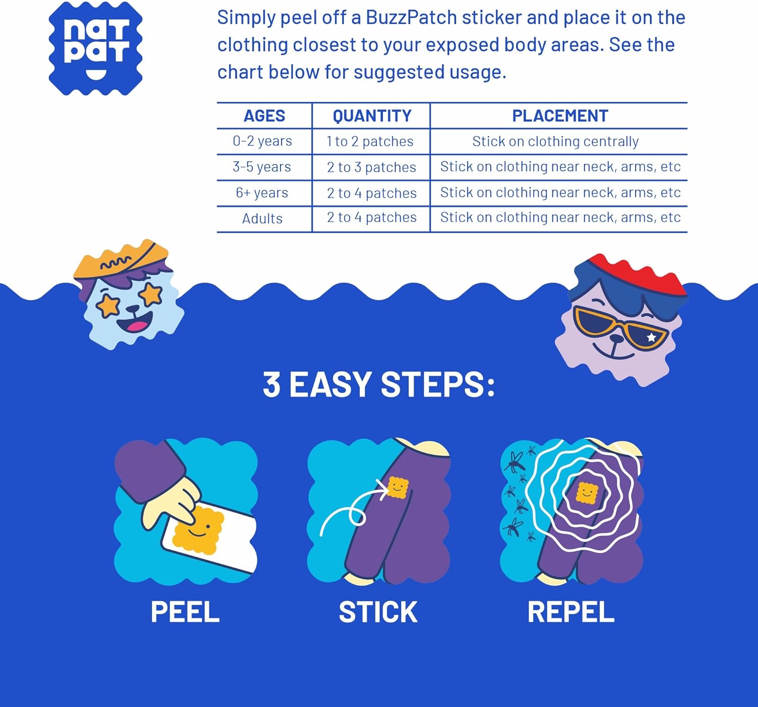 - MEDICAL GRADE ADHESIVE PATCHES – Made from non-woven, medical-grade fabric, NATPAT BuzzPatch Mosquito Patches are durable, water-resistant, and designed to stay in place during all kinds of activities. With a pleasant scent and gentle ingredients, these family-friendly patches offer dependable protection for both kids and adults.