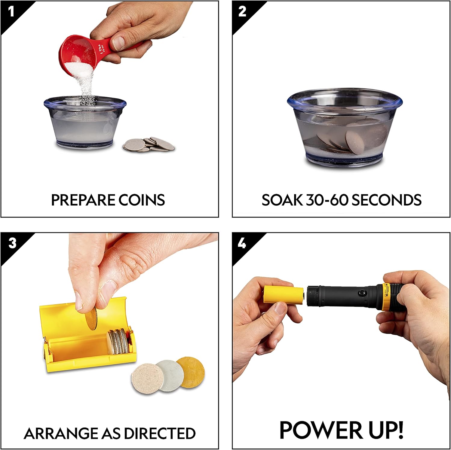 - COIN POWERED FLASHLIGHT - The science experiments for kids in this kit continue with an amazing penny flashlight. Kids will construct a battery with the included "coins" and see the electric circuit come to life when they turn on the flashlight.
