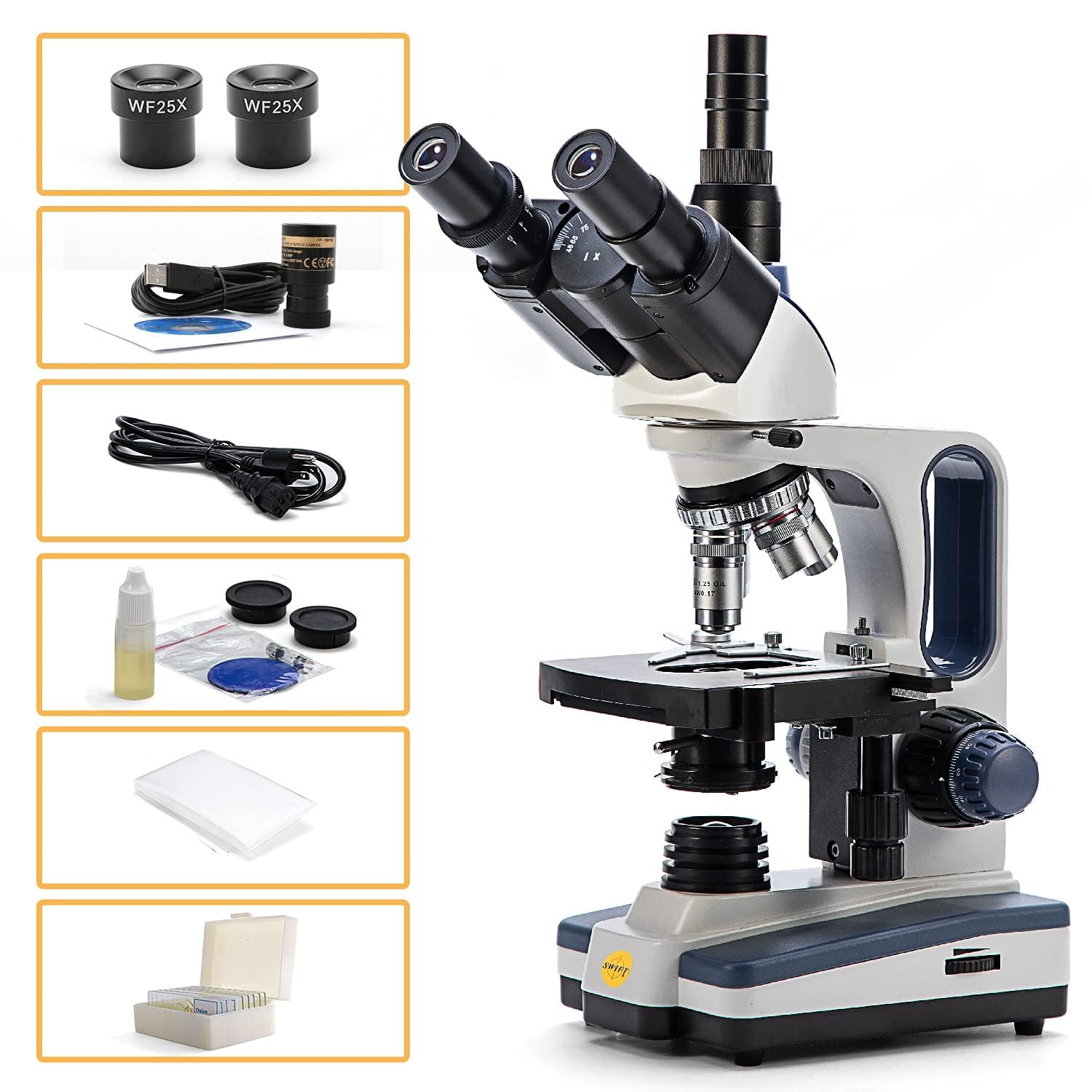 Swift SW350T Compound Trinocular Microscope,40X-2500X Magnification,Two-Layer Mechanical Stage,with 5.0 mp Camera and Software Windows/Mac Compatible and 5 PCS Prepared Slides and 5 PCS Blank Slides