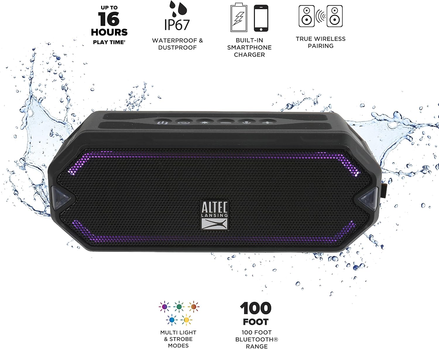Altec Lansing - HydraJolt Wireless Bluetooth Speaker, Waterproof Portable Speakers with Built in Phone Charger and Lights, Everything Proof Outdoor, Shockproof, Snowproof, 16 Hours Playtime