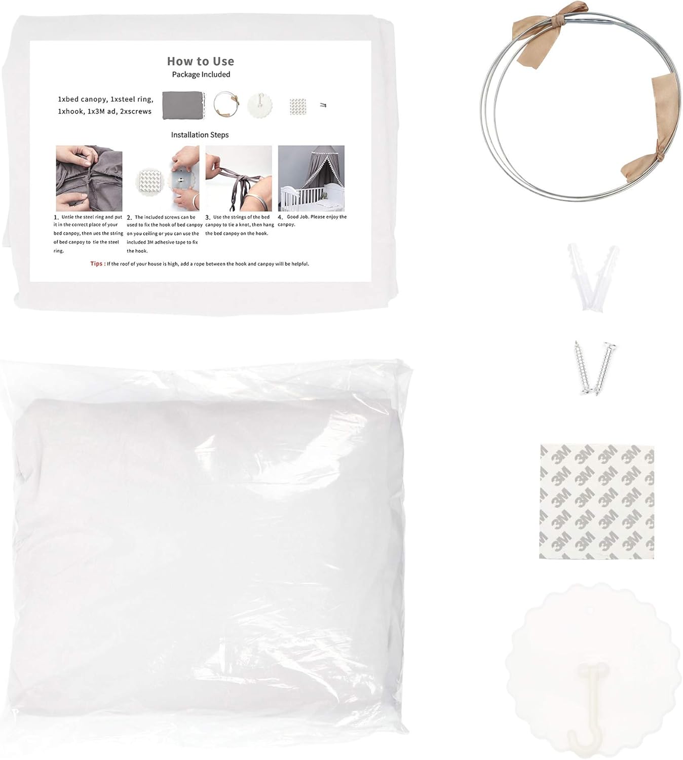 - BIGGER SIZE & EASY TO ASSEMBLE - Kids canopy total height 95”; upper part length 20”, dome diameter 20”. Suitable for crib/cradle/bassinet/cot, toddler bed, play area mat/rug. Features an opening for easy entrance and cutest frills decoration! Package Included: 1 x bed canopy, 1 x steel wire, 1 x double-adhesive tape & hook panel, 2 x self-tapping screws, 1 x user manual