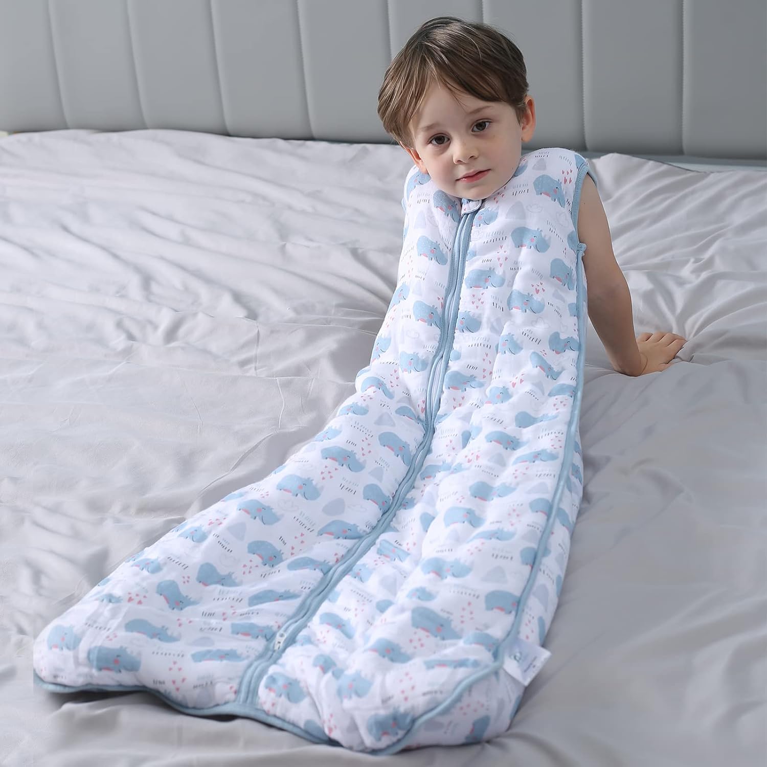 - 70% Rayon and 30% Cotton Sleep Sack: This fabric is made from viscose made from 70% Rayon and 30% Cotton. This warm sleeping sack is filled with 100% recycled polyester fiber filling and washed cotton with a 2.5 TOG rating for an ultra-soft and cozy feel, making it perfect for cool and cold conditions. The muslin material is more breathable than knitted fabrics, providing a comfortable sleeping environment for your baby