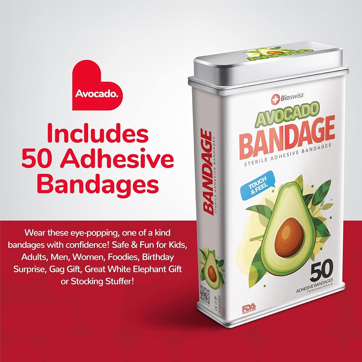 - AVOCADO BANDAGES: This 50 piece tin of adorable and delicious looking avocado bandages is great for putting a smile on kids' faces while protecting wounds such as cuts, scrapes, and burns; sticky bandages are perfect for kids and adults alike, and also for school nurses and pediatric doctors