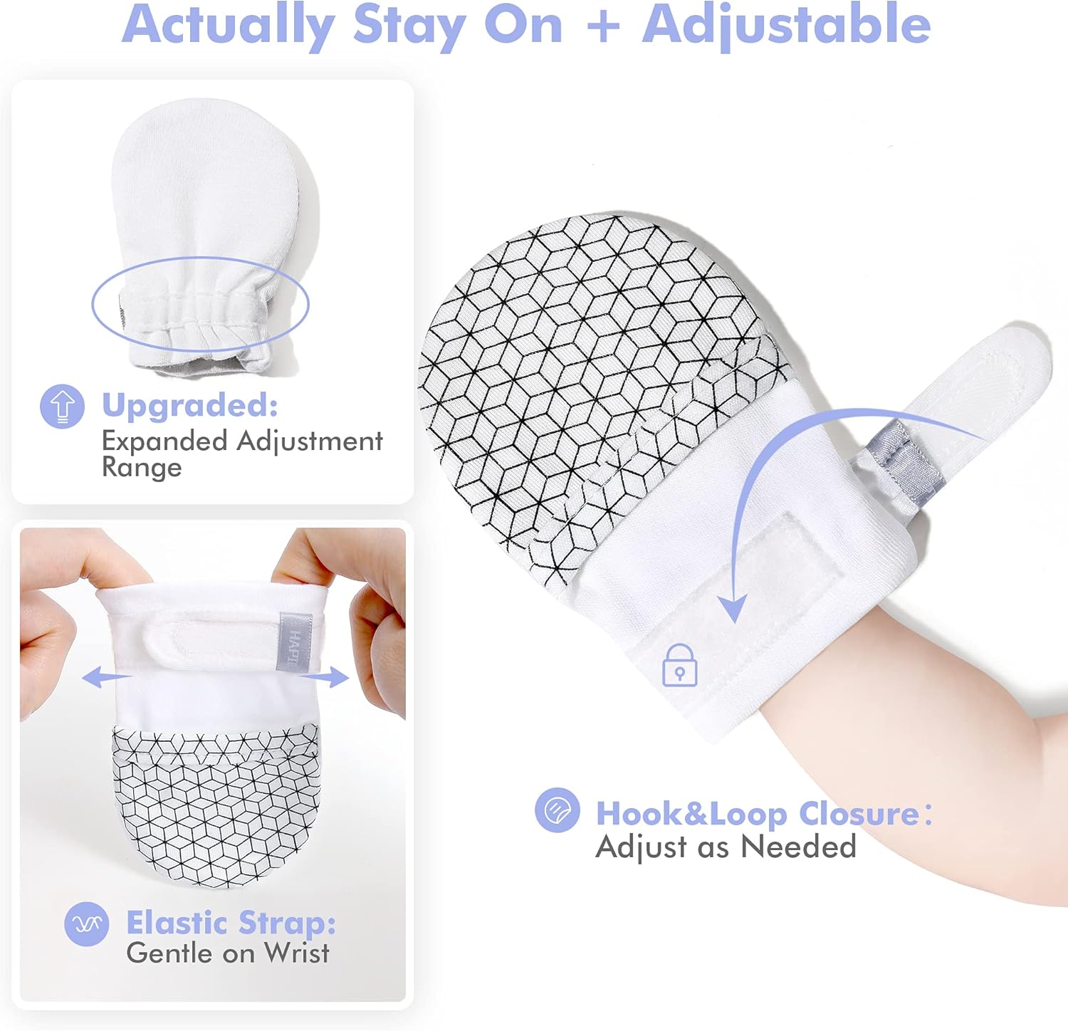 HAPIU Baby No Scratch Mittens Stay On, 100% Cotton Breathable, Adjustable Infant Gloves for Boys Girls, Newborn - 12 M