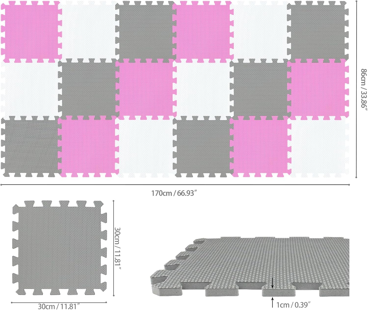 qqpp EVA Rubber 18 Tiles Interlocking Puzzle Foam Floor Mats - Baby Play Mat for Playing | Exercise Mat for Home Workout. White, Pink, Gray. QC-ACLb18N