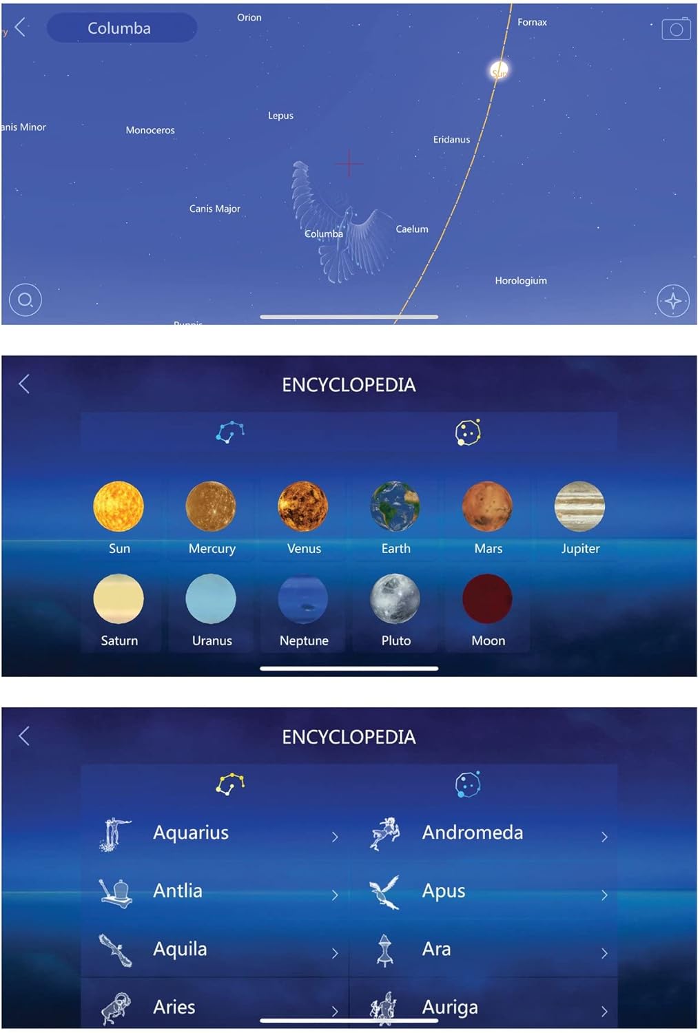 - ASTRONOMY APP AND SMARTPHONE ADAPTER: Comes with a encyclopedic astronomy app for smart phones that names and outlines constellations in the viewing area as you move the telescope across the night sky. You can take a photo using the app that will superimpose the constellation information from the ap onto the night sky. Also, using the included smartphone adapter, you can take a picture through the telescope to share with friends and family.