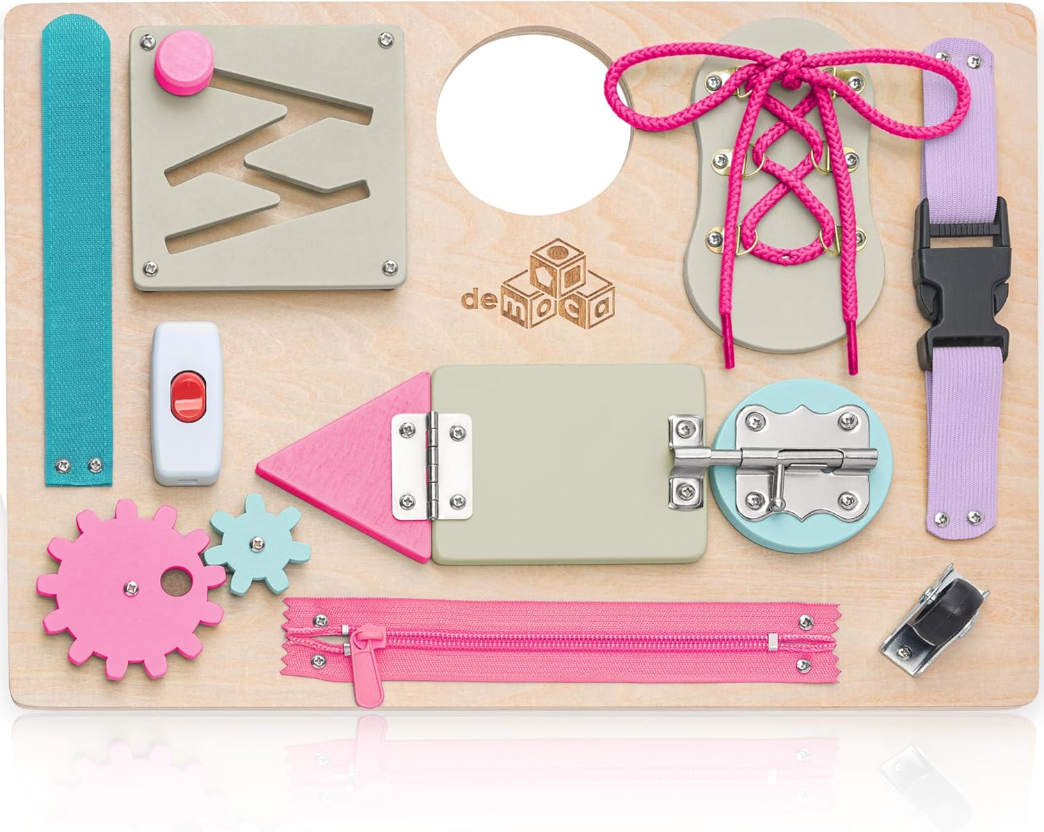 • Montessori Busy Board for Toddlers - Our sensory board for toddlers features 10 engaging activities for fine motor skills, problem-solving, and cognitive growth. Designed for preschool learning, it helps kids practice essential life skills like zipping and tying. Lightweight and travel-friendly, this toddler busy board is perfect for screen-free play at home or on the go.