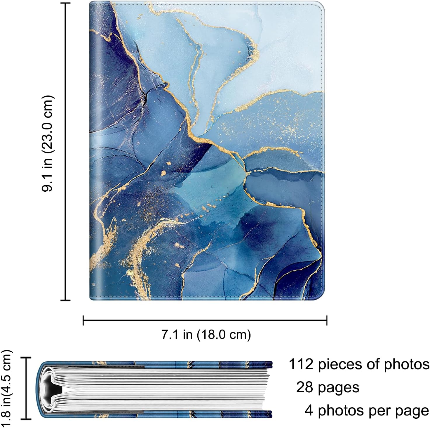 - Hold 112 photos in total. This album contains 28 individual pages with 2 inserts per side [4 photos per page], opens like a book for easy viewing. Designed with insert pocket for credit cards and name cards. Best for weddings, engagements, graduations, baby photos or other arty obsessions.