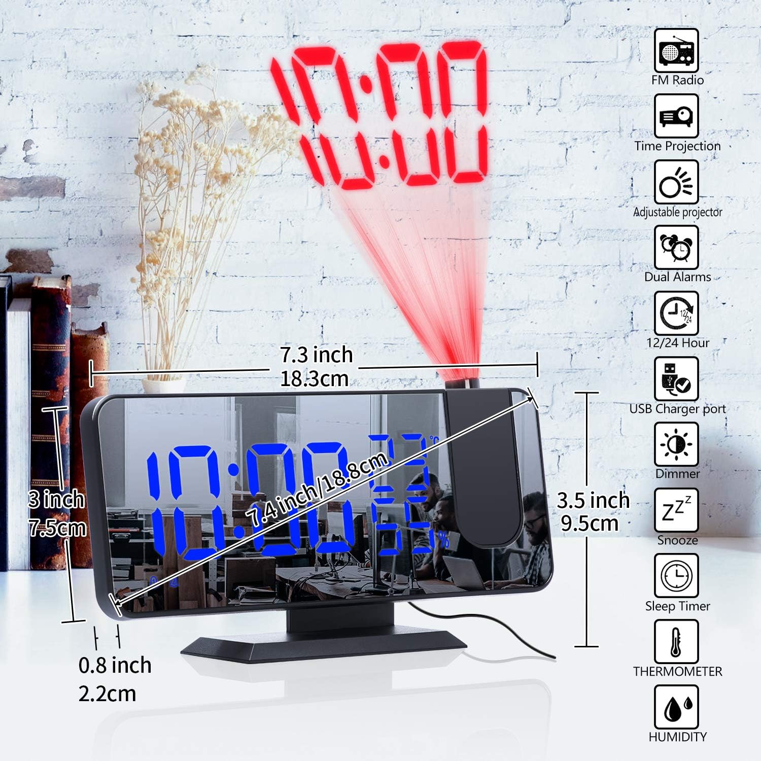 Projection Digital Alarm Clock for Bedrooms,Alarm Clock Radio on Ceiling, USB Charger Port, Temperature & Humidity Display, 7.3” Large Mirror LED Display,12/24H,Snooze,Dual Loud Clock- 4 Dimmer