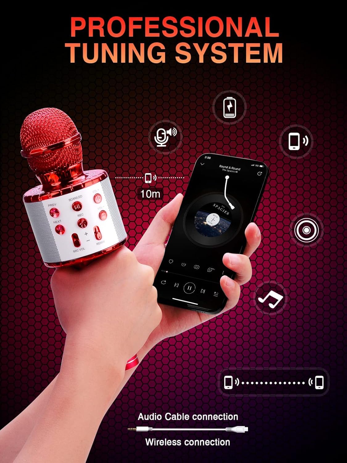 - ♫【4 in 1 Karaoke Microphone】Portable hand-held wireless microphones can be used as microphone, speaker, loudspeaker, recorder. Mini home KTV for music playing and singing at any time.