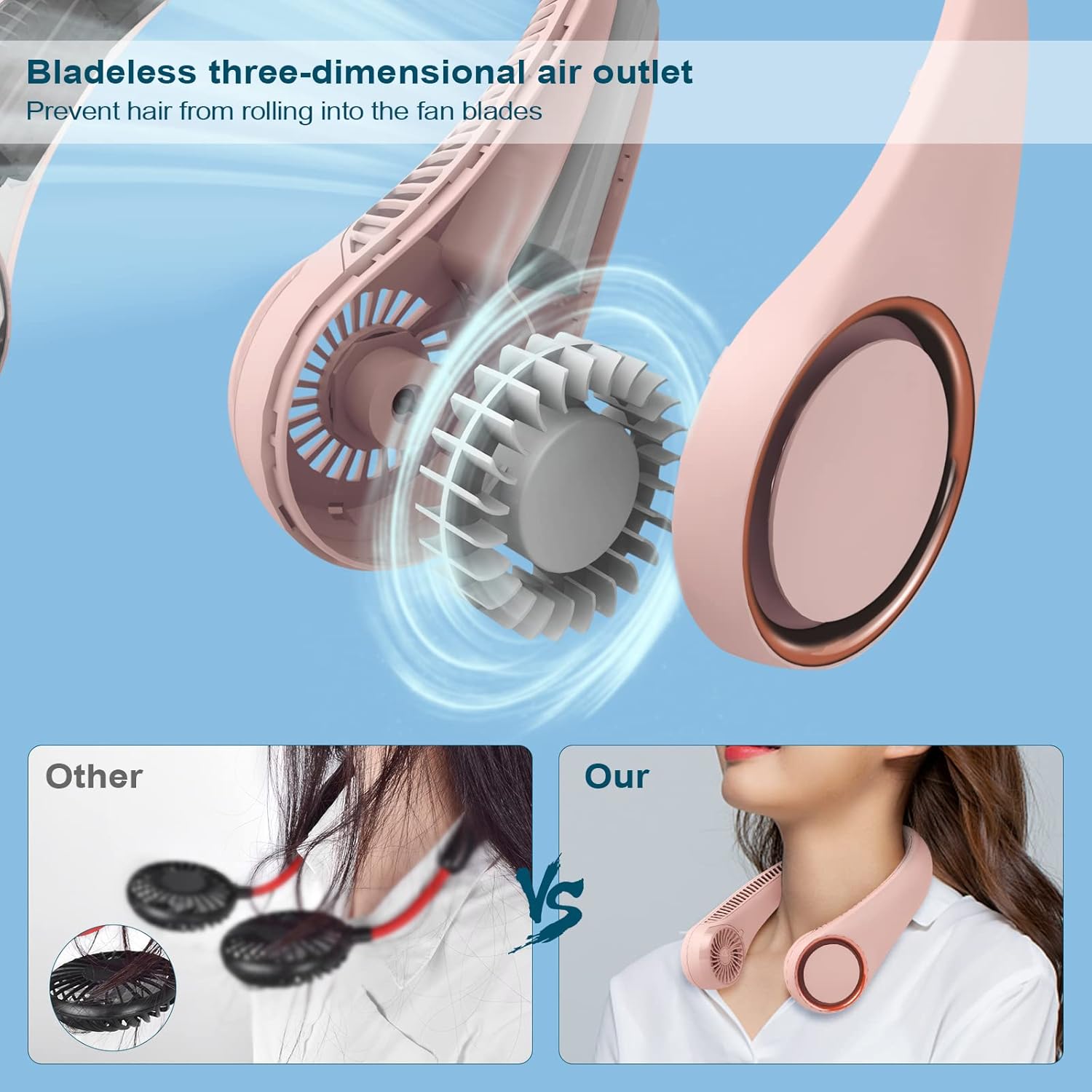 - Cool and safe: Upgraded neck fan with 78 air vents, innovative turbo fan blades and wind hole design, efficient division of air and feel the cooler breeze more gently. The design of the bladeless neck fan can be used safely by children and the elderly