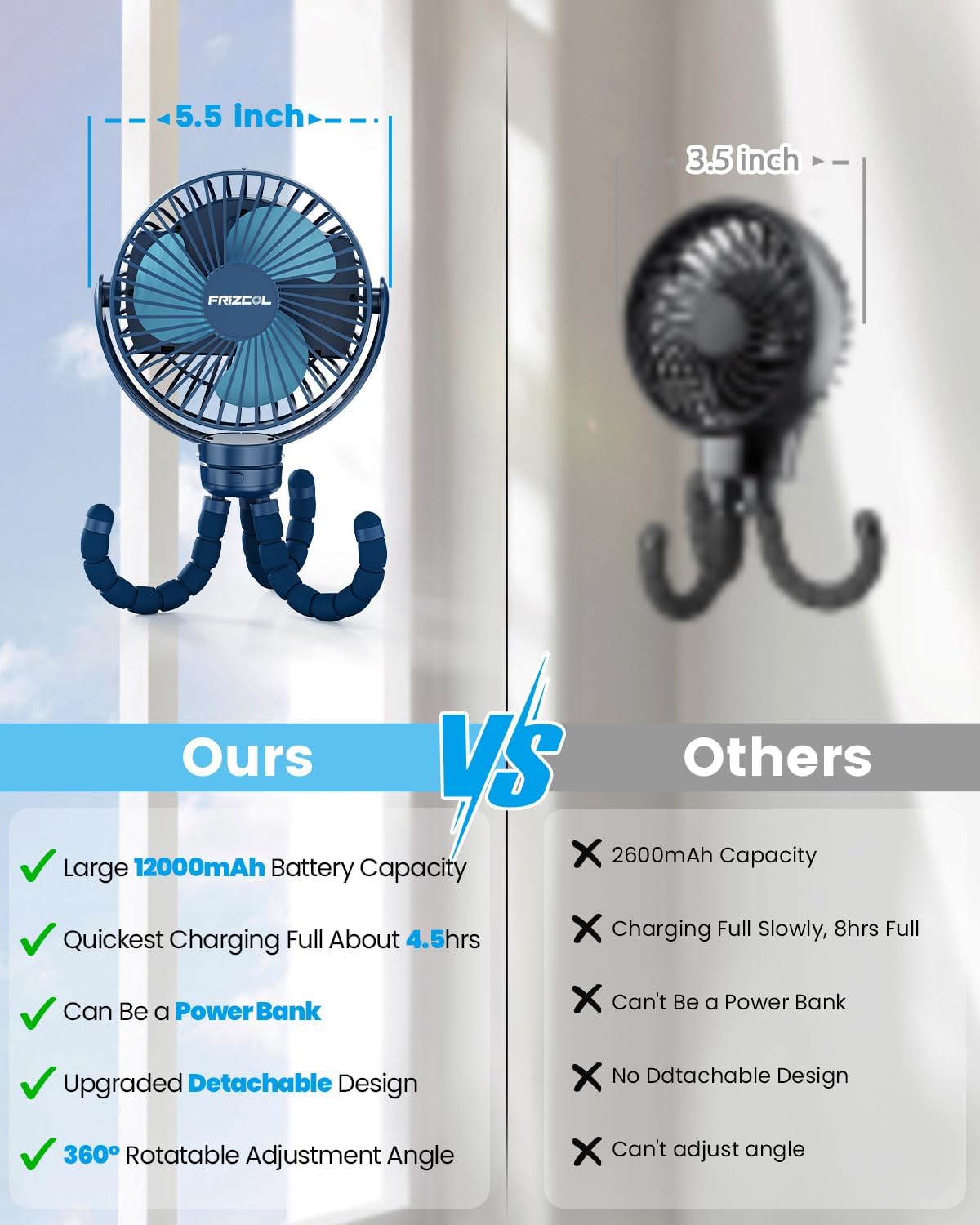 FRIZCOL 12000mAh Portable Stroller Fan, Use As Power Bank, 65H Battery Operated Fan Flexible Tripod Clip On Fans, Detachable Personal Handheld Baby Fans for Stroller, Car seat, Desk, Treadmill (Blue)