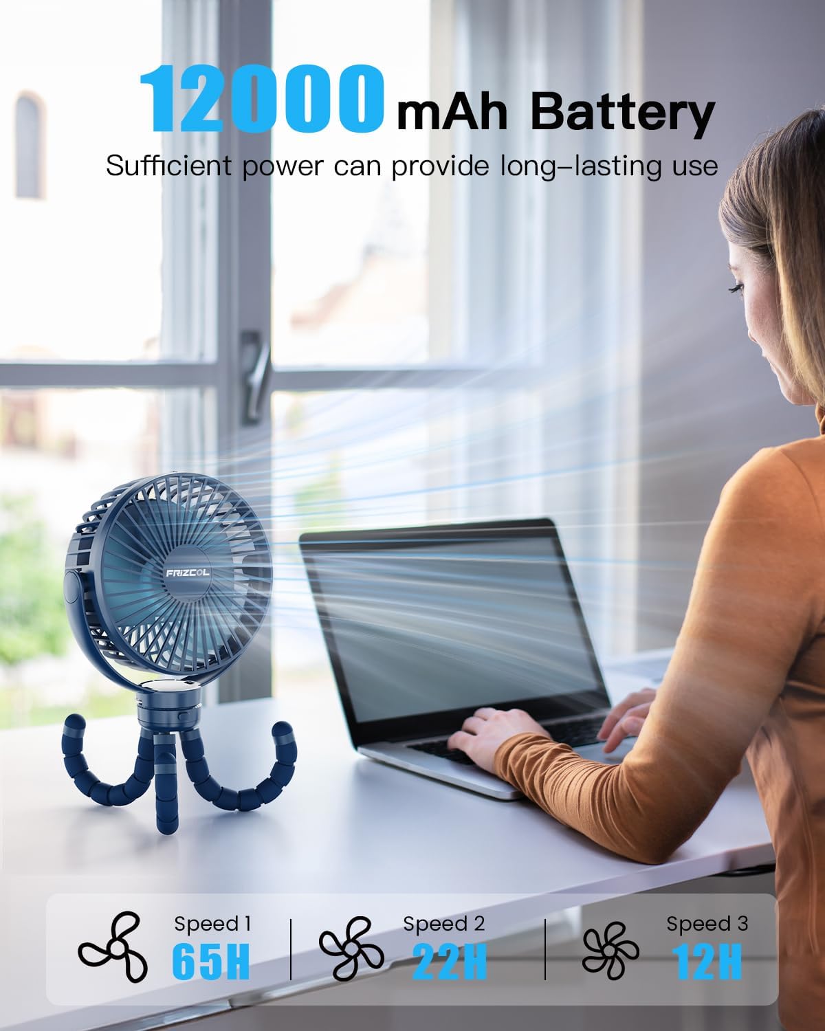 - INCREDIBLE 65-HOUR BATTERY LIFE, USB RECHARGEABLE FAN: Our battery powered fan built-in 12000mAh rechargeable battery, its battery will last anywhere from 12 to 65 hours depending on the fan speed setting. Simply charge it through a USB port from a power bank, pc, hub, outlet, etc. This flexible tripod fan is compact, lightweight, and gives an impressive cooling effect.