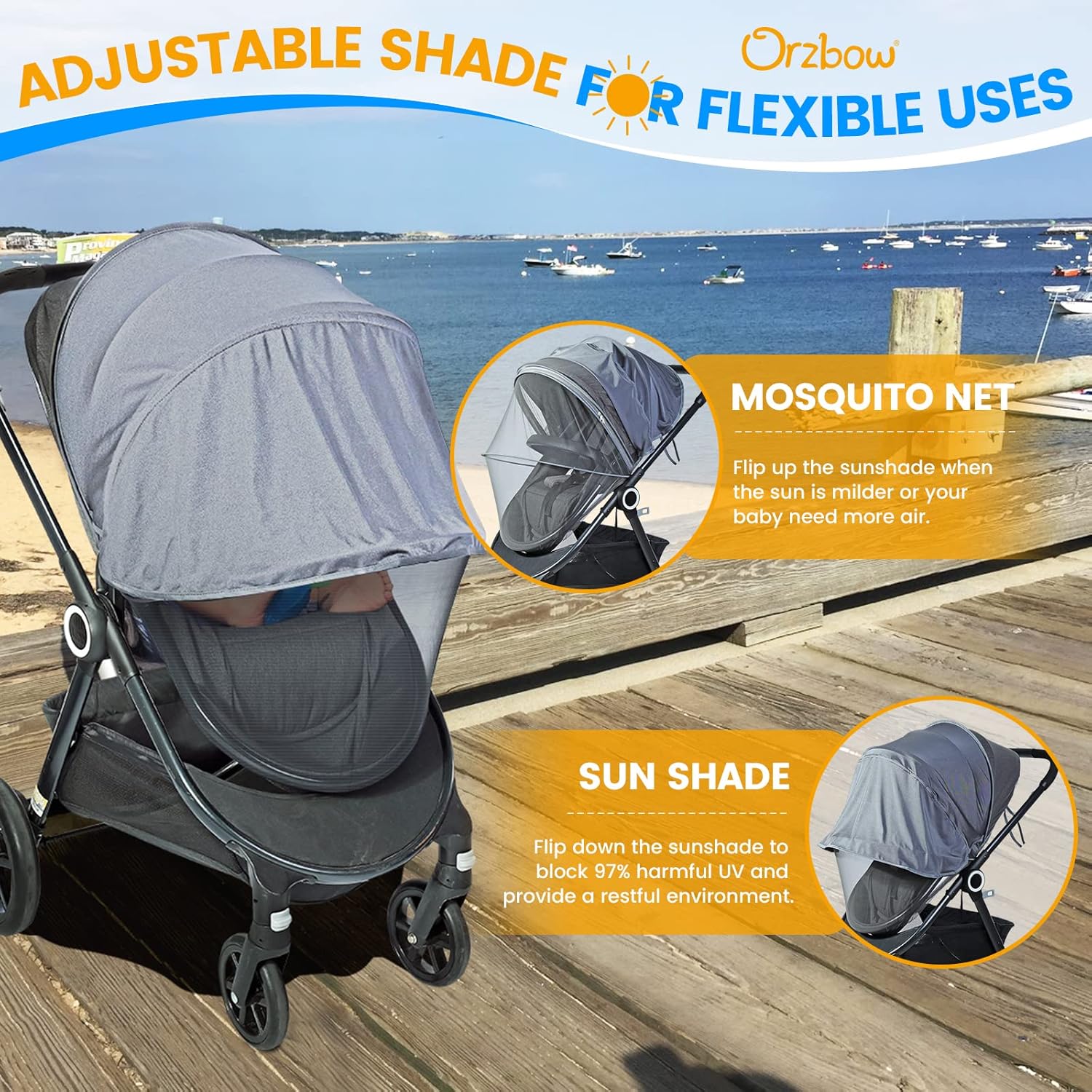 - ⛅【UPF50+ Sun Shade Mosquito Net】Orzbow Upgraded Edition Stroller Net is equiped with a Adjustable Sun Shade with UPF50+, and it can actually help you in summer without purchasing other expensive Sun Shade. The hexagonal honeycomb mesh design makes Orzbow Fly Net tear-resistant and barrier properties better, preventing insects from entering, whose good air permeability keep your baby cosy and cool while enjoying a happy outdoor walk, travel or camping.