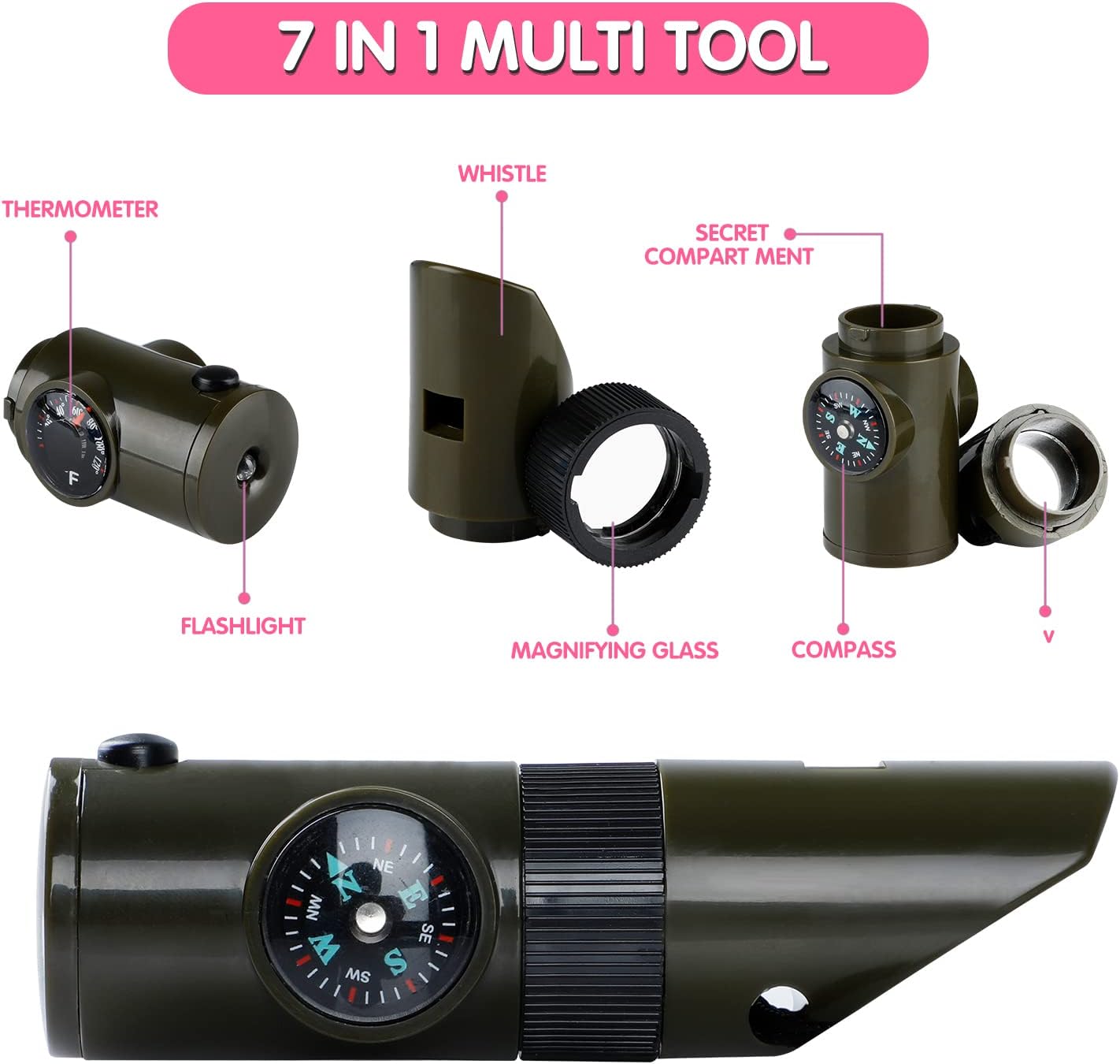 - Complete Kids Adventure Kit - Full Kids Exploration and Adventure Set includes Safari Cargo Vest x1, Safari Hat x1, Binocular x1, Kids Backyard Bugs Book x1, Telescopic Butterfly Net x1, Magnifying Glass x1, 7 IN 1 Multi Tool x1(which contains flashlight, thermometer, compass, whistle, magnifying glass, mirror and secret compartment), Bug Collector with Magnifier x1, Tweezer x1, Bug Tong x1, Organization backpack x1.