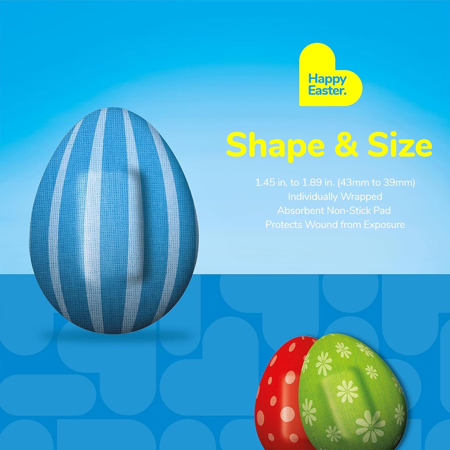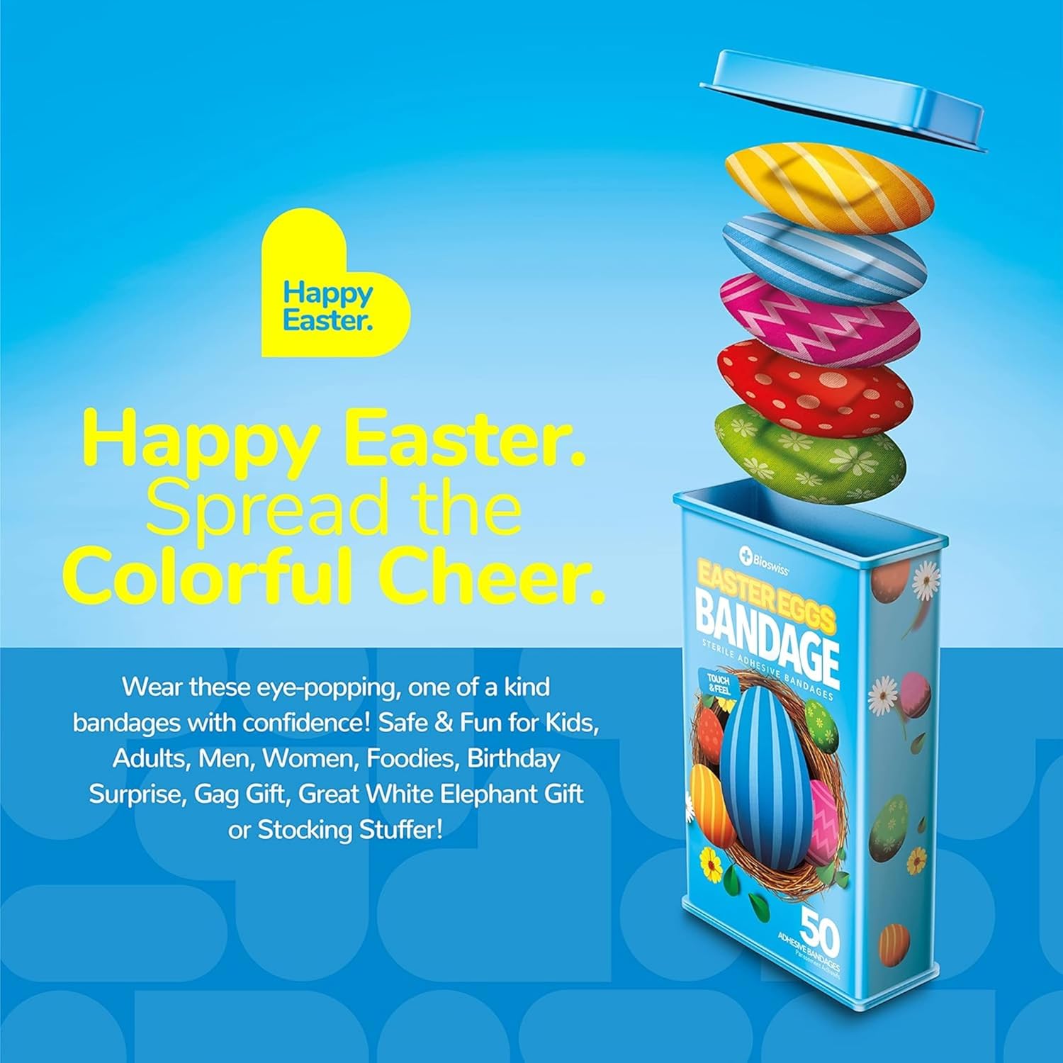 - EASTER EGG BANDAGES: This 50 piece tin of adorable Easter eggs bandages is great for putting a smile on kids' faces while protecting wounds such as cuts, scrapes, and burns, and come in 5 assorted styles; sticky bandages are perfect for kids and adults alike, and also for school nurses and pediatric doctors