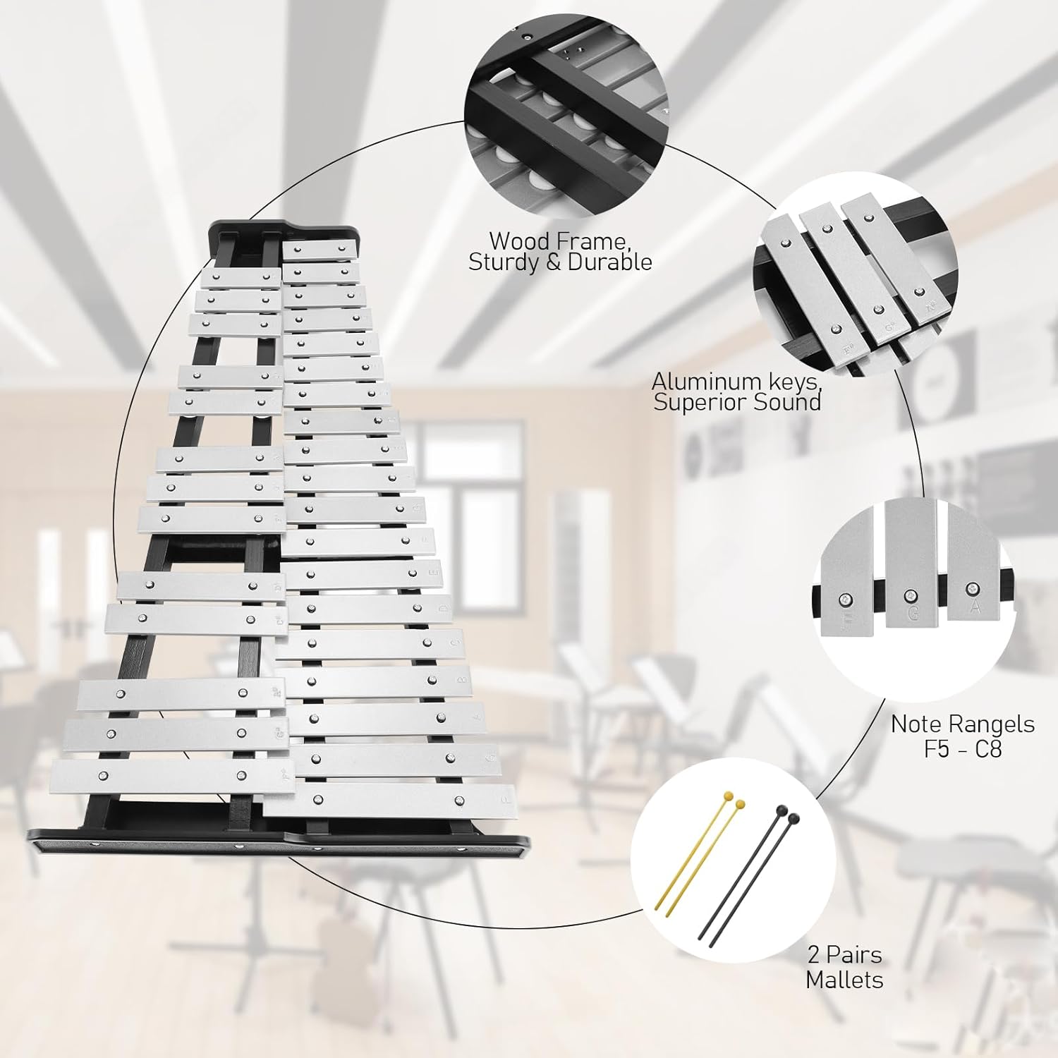 - 【32 Notes Professional Glockenspiel】 Note range: F5 - C8. Each note is marked on the corresponding beat, each of them is perfectly tuned and tested. The thick aluminium keys with 2 beaters produce a very long and clear percussion sound.