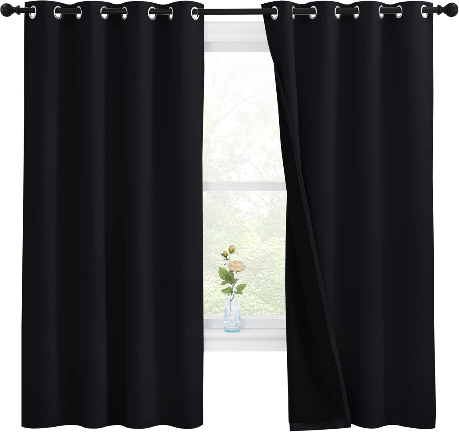 NICETOWN 100% Blackout Curtains with Black Liners, Thermal Insulated Full Blackout 2-Layer Lined Drapes, Energy Efficiency Window Draperies for Bedroom (Black, 2 Panels, 55-inch W by 68-inch L)