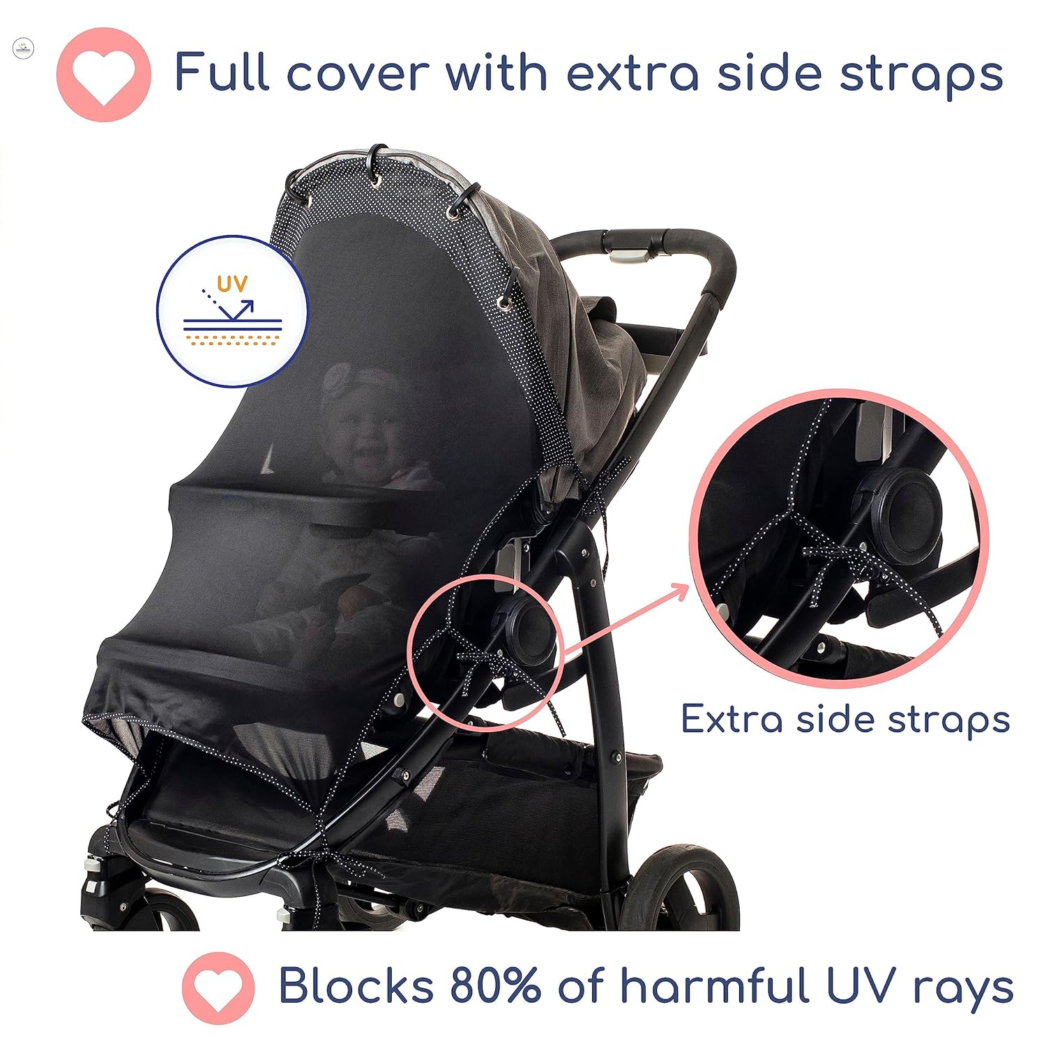 - Sun Protection With No Compromise - Blocks up to 80% of harmful sunrays. The ultimate stroller shade, sun protection for baby stroller, and sun blocker for stroller in one breathable, see-through design.