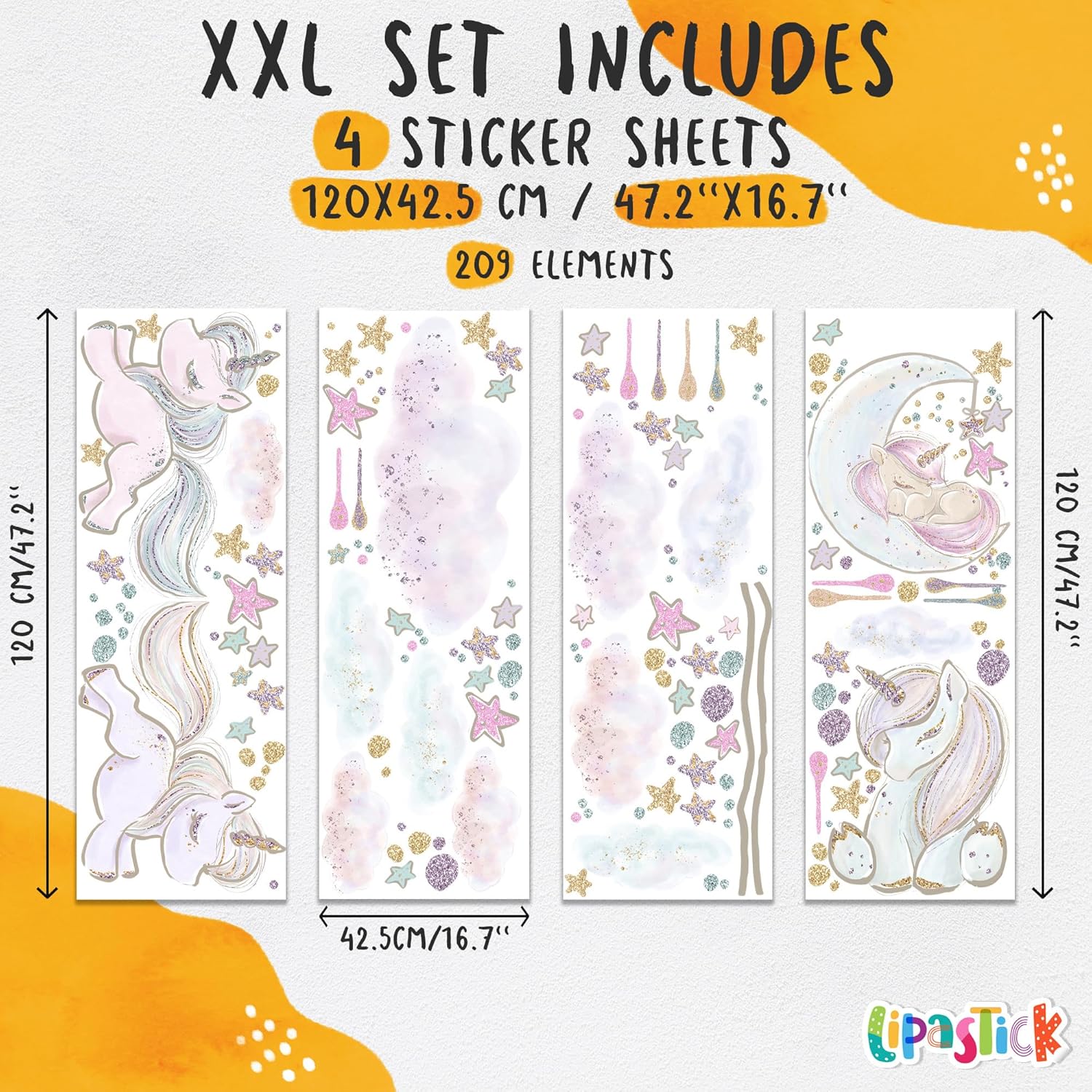 - 🦄 Package Content: Large decals for baby room come in a pack of 4 sheets. Includes: unicorns, stars, clouds, moon. The sheet size is 47.2" x 16.7". This set of stickers is size XXL and its finished size is 156.2" x 48”. Perfect for covering full wall.
