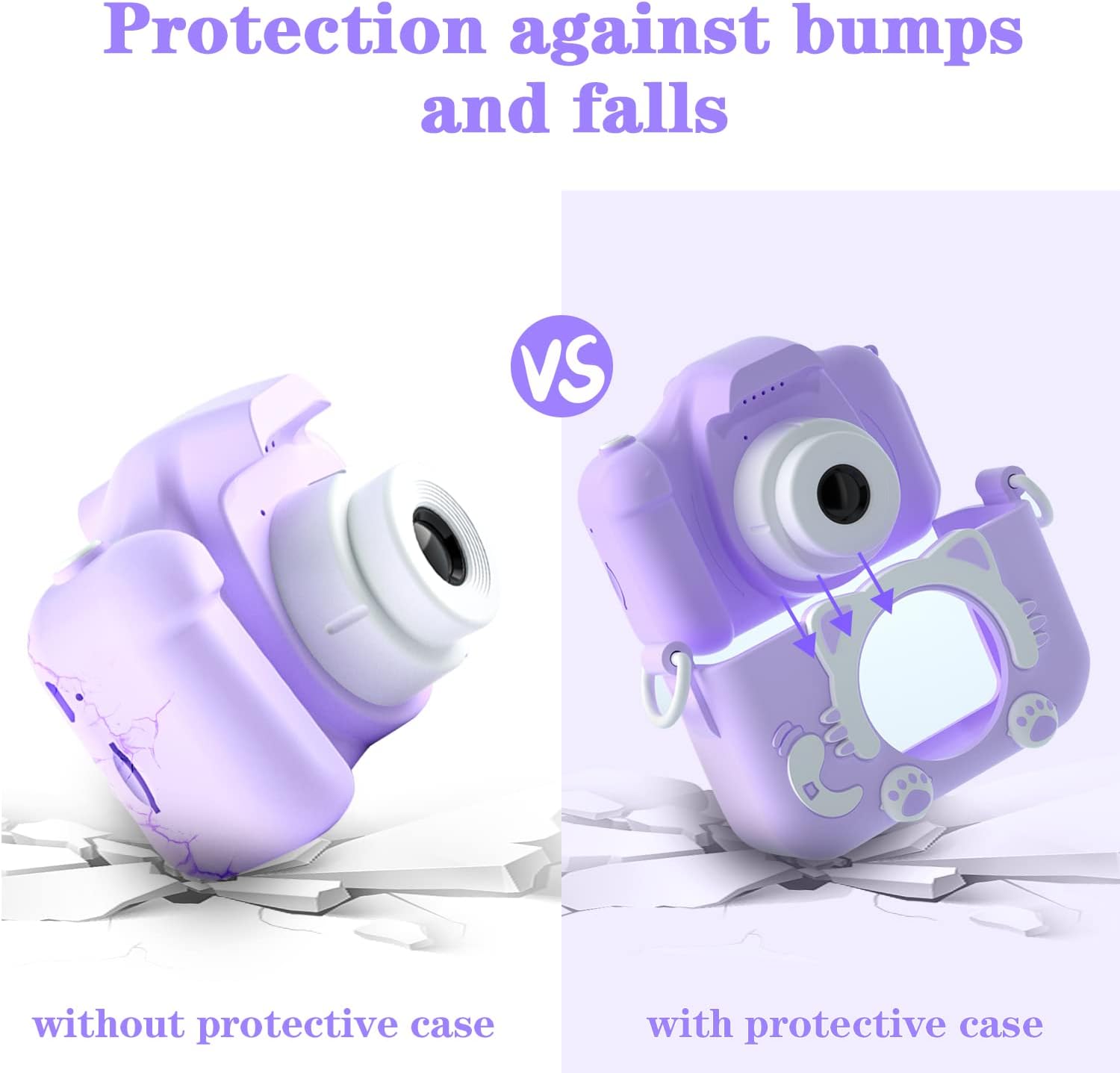 - 【Protective Silicone Case Included】This kid's Camera is Environmentally friendly materials with safety standards, it’s non-toxic, shock-resistant, and durable materials. We all know little ones are still learning to be careful with things. The anti-drop silicone casing provides the toddler camera with shockproof protection against bumps and falls. The camera for kids has an enduring lanyard for portability which is specially designed for children to hang the mini camera on their neck.