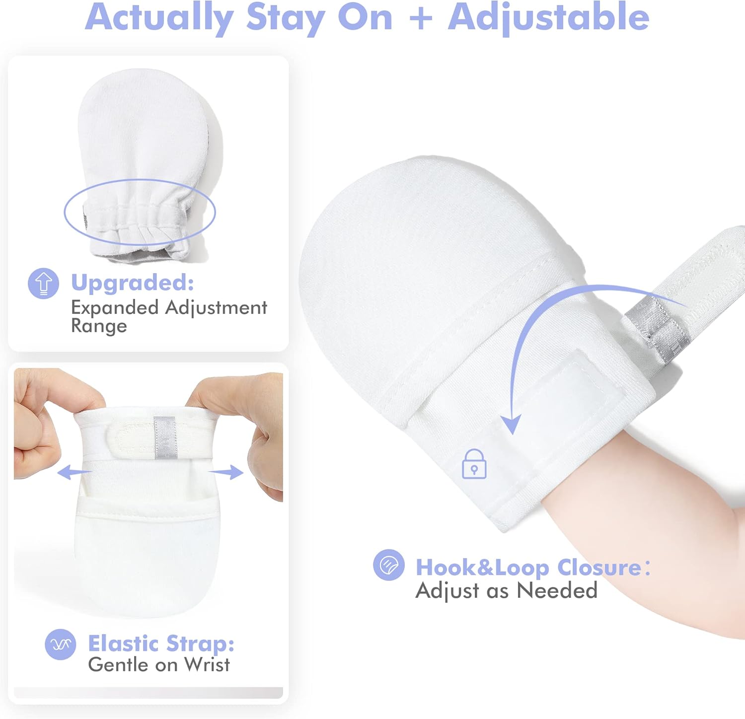 HAPIU Baby No Scratch Mittens Stay On, 100% Cotton Breathable, Adjustable Infant Gloves for Boys Girls, Newborn - 12 M