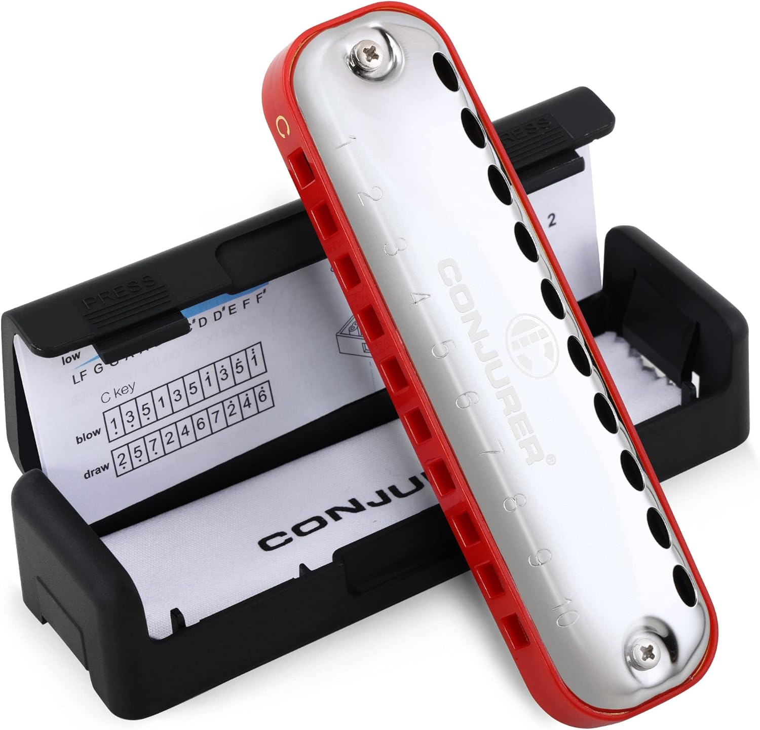 - CONJURER blues harmonica in C (model:WH1007) is basic harmonica for beginners. It is specifically developed for young children, it has arc-shaped corners instead of sharp edges and corners, making it safe for kids to use. It is a diatonic 10-hole harmonica with 20 tones that may be played by adults, kids, and novices. Blues, folk, rock, country, jazz, and other genres may all be played on a blues 10 hole harmonica.