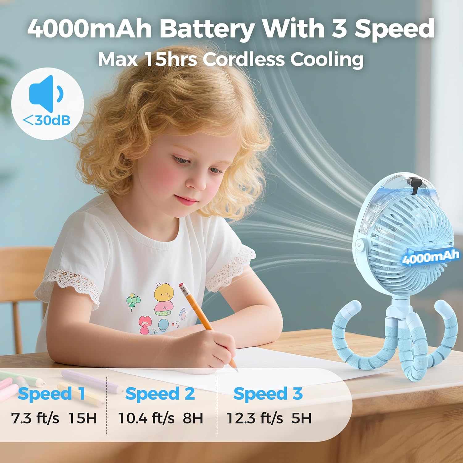 - 3-Speed Quiet & Adjustable Breeze: Tailor your comfort with 3 speed settings, generating a strong yet quiet breeze (<30dB)—ideal for napping babies or relaxing outdoors. The 7-inch flexible tripod attaches to strollers, car seats, or stands freely