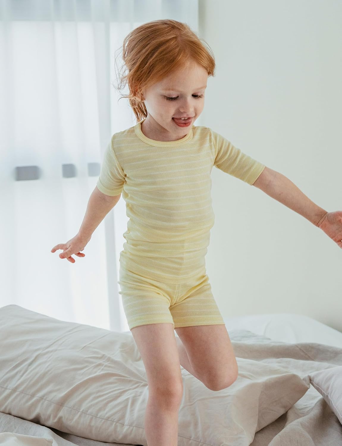 - COMFORTABLE FABRIC - This stylish Stripe Pattern pj set is a perfect blend of multi-functional style and comfort. Viscose is like a smooth material similar to silk breathable, similar to cotton in this regard. Enough to help protect child's delicate skin. That's why pajama set is Easy to dye, light weight, and natural material. It will give perfect fit.