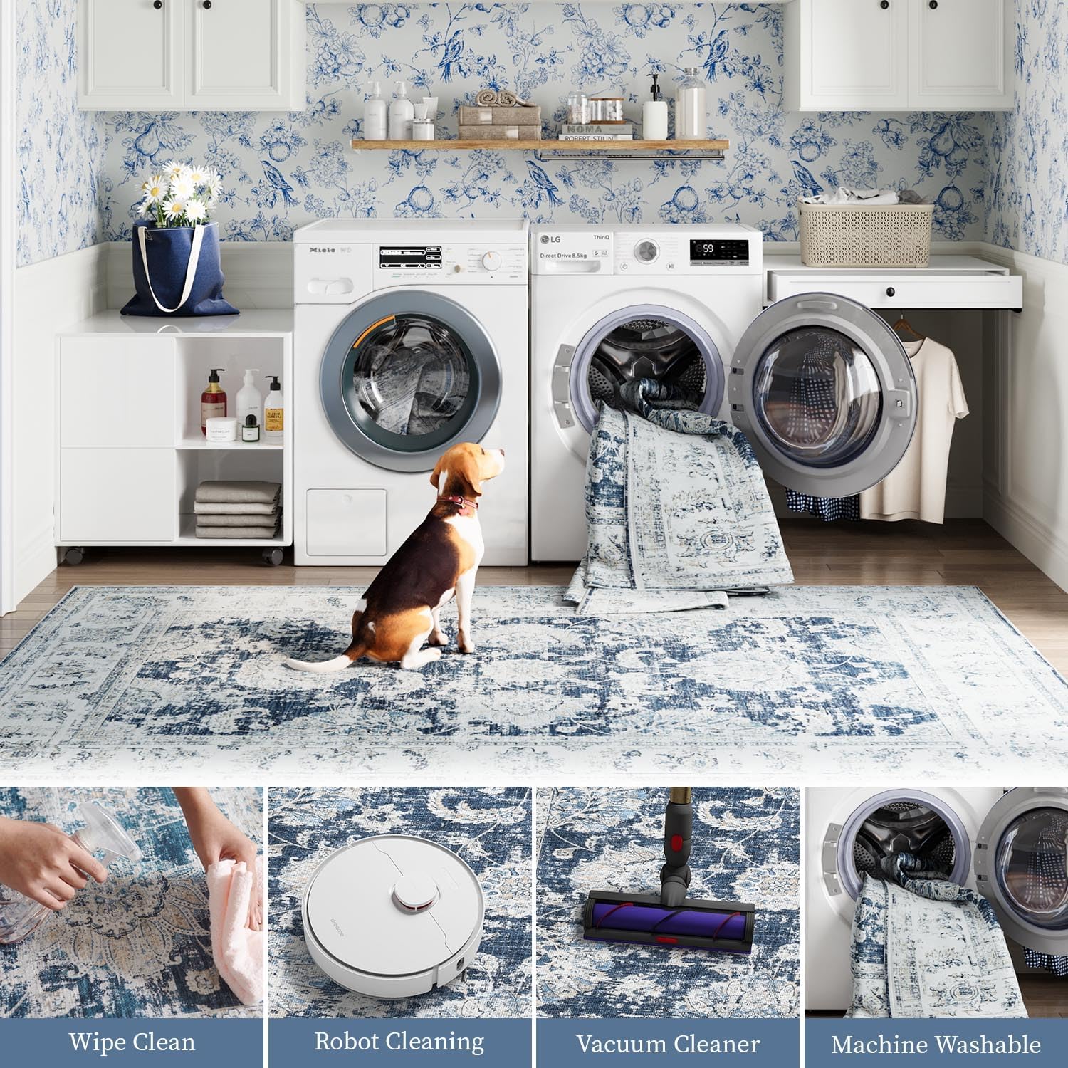 jinchan Runner Rug 2x5 Machine Washable Hallway Rug Dark Blue Vintage Floral Print Non-Slip Low Pile Ultra-Thin for Kitchen,Entryway,Laundry Room,Bedroom,Farmhouse (2‘x5’,Dark Blue)