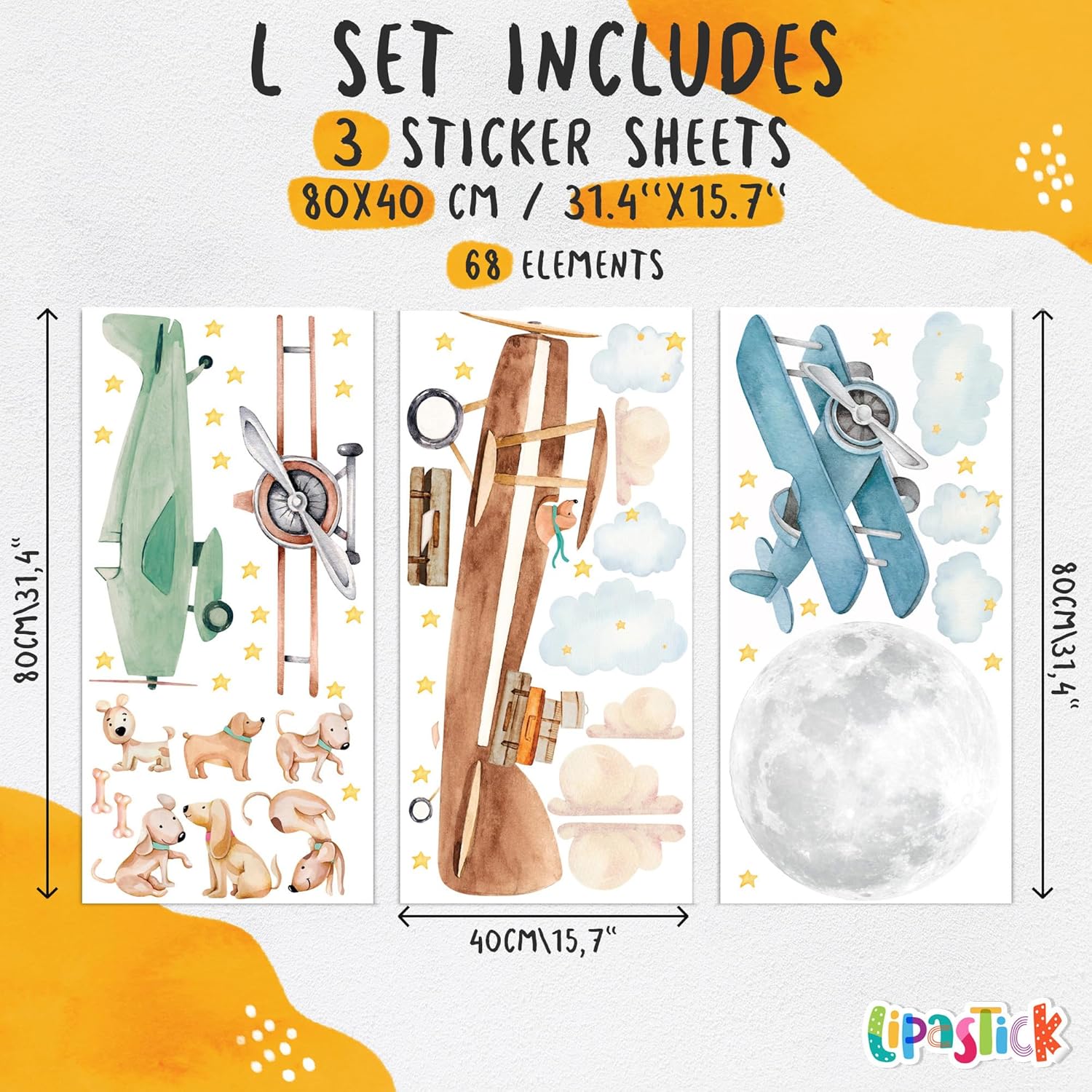 - ✈️ Package Content: Airplane classroom decor comes in a pack of 3 sheets. Includes: airplane, stars, dogs and clouds. The sheet size is 31.4" x 15.7". This set of stickers is size L and its finished size is 100" x 59”. Perfect for covering large spaces.