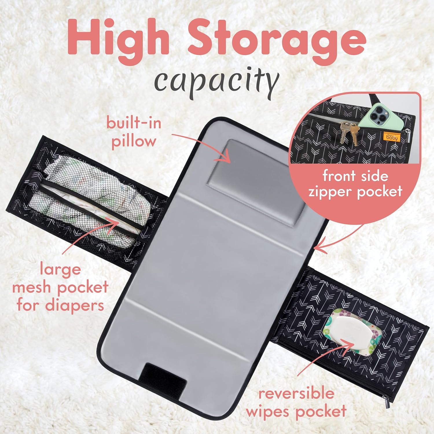 - Smart & Multipurpose Travel Bag - This travel changing pad has 2 sides, a reversible wipe holder for wipe access, and a front zipper pocket. It also has Velcro straps for stroller attachment and more!