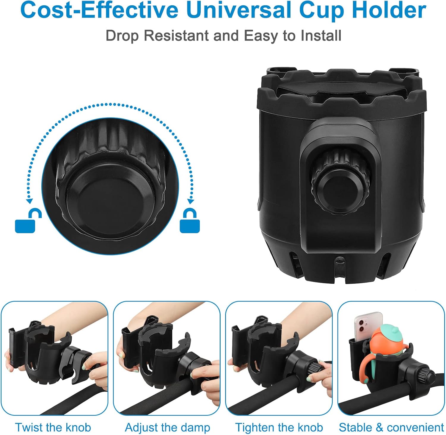 - This stroller cup holder with a phone holder, it can load drink bottles and mobile phones at the same time. You can see new messages, incoming calls in the first time. It fits for most mobile phones.