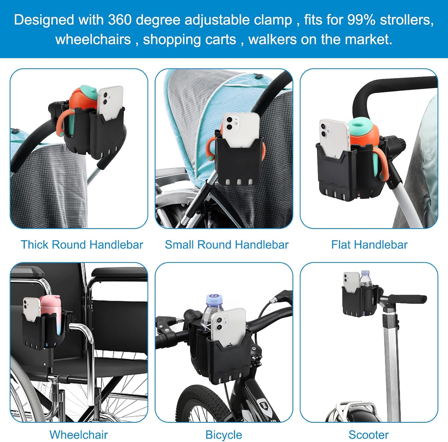- This universal cup holder fits for most stroller, walker, wheelchair, bicycle, scooter, boat handle bar, shopping cart, kayak, ATV, motorcycle, treadmill etc. It compatible with stroller handlebars with a diameter of less than 1.6 inches.