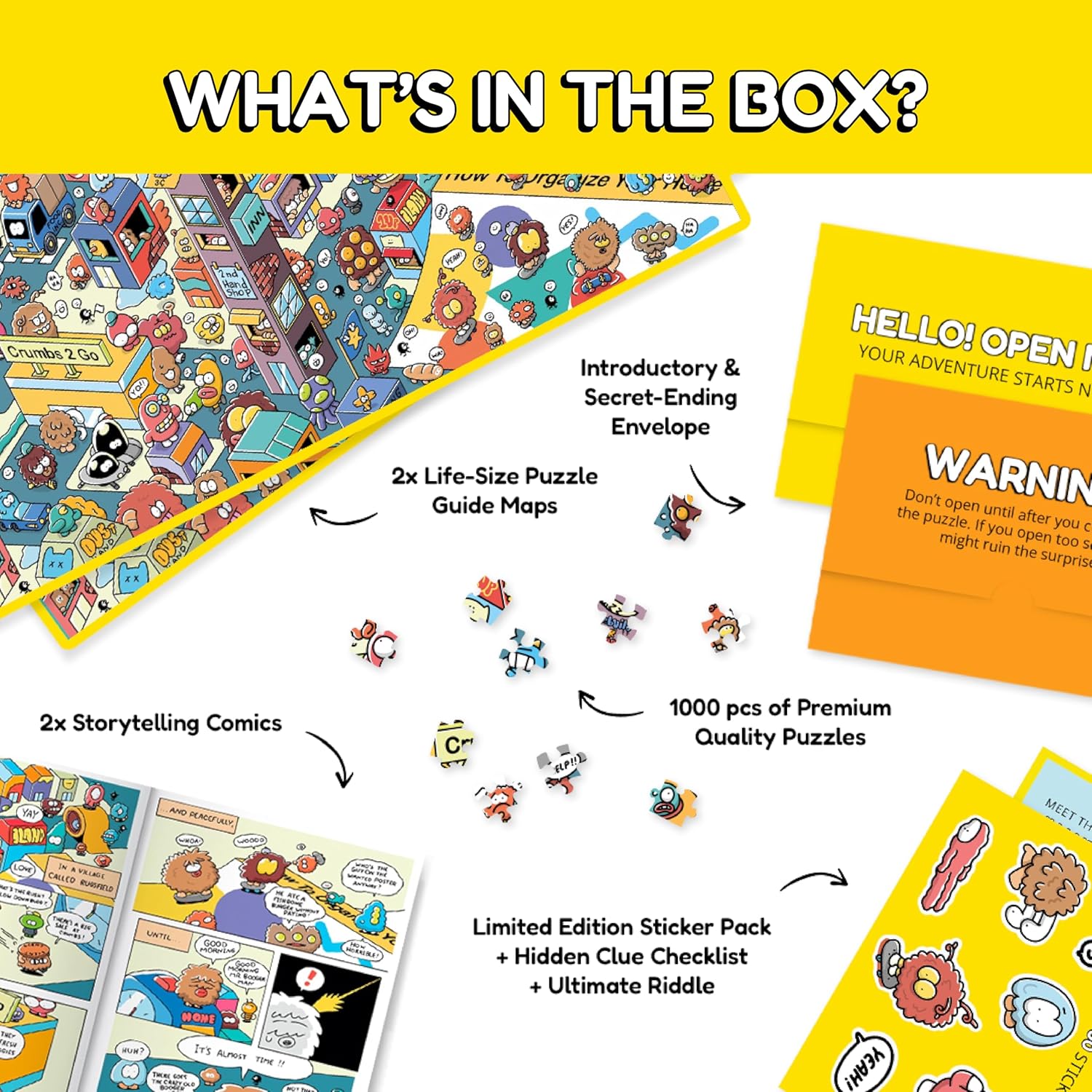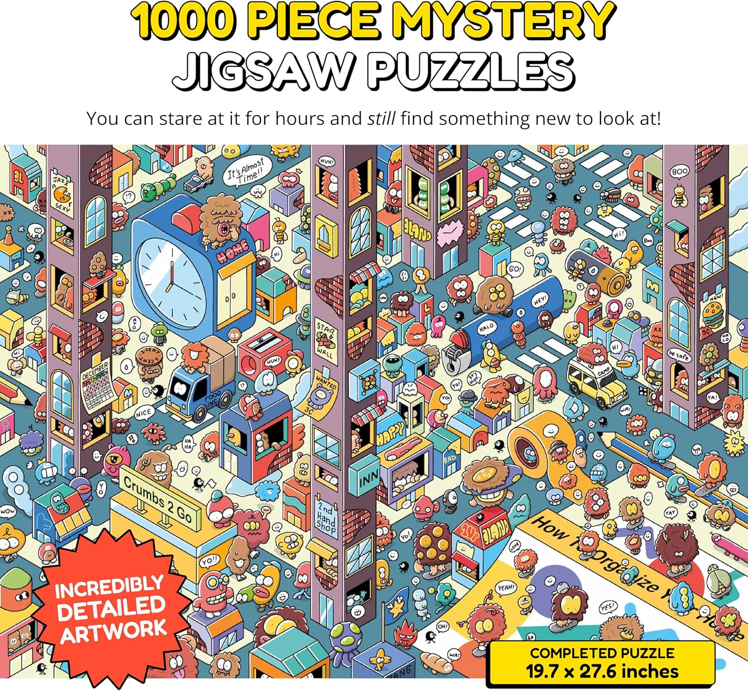 - Unique Jigsaw Puzzle with a Twist - The picture on the box isn’t the final scene! This 1000 piece mystery puzzle changes as you build, revealing hidden jokes and a surprise ending you won’t expect.