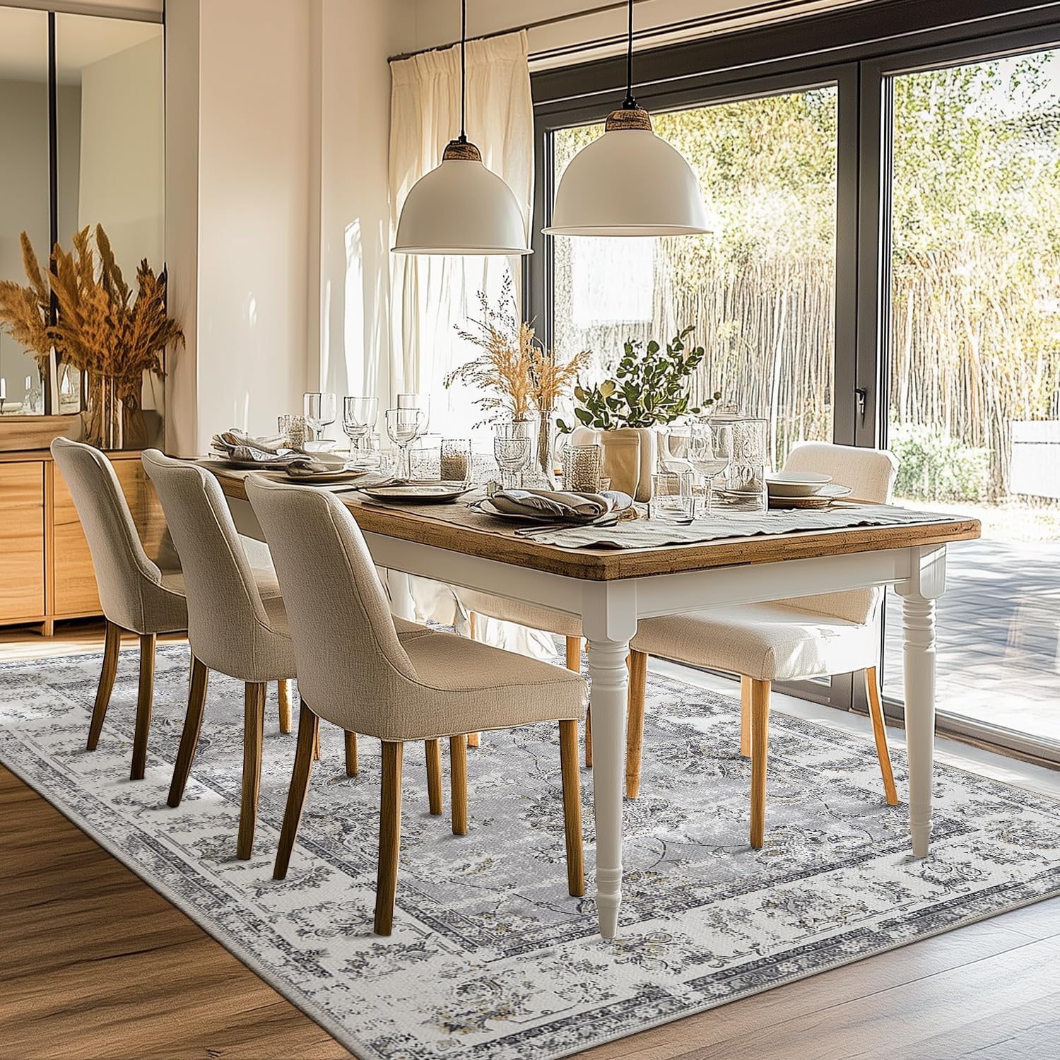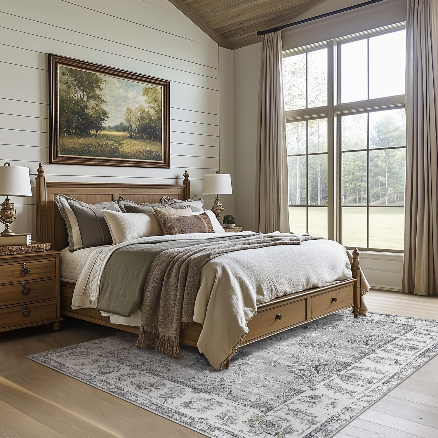 jinchan Vintage Floral 5x7 Area Rugs for Bedroom - Machine Washable Distressed Design Stain Resistant Boho Carpet Ultra-Thin Low Pile Non-Slip Rug for Living Room Dining Room Kitchen (5‘x7',Grey)