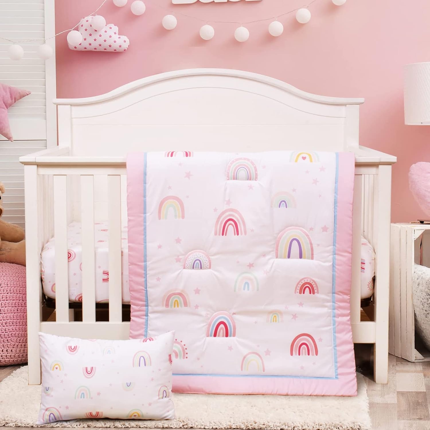 UOMNY Crib Bedding Set for Girls 3 Piece with Comforter Sheet Toddler Pillowcase Baby Bedding Sets Pink Rainbow