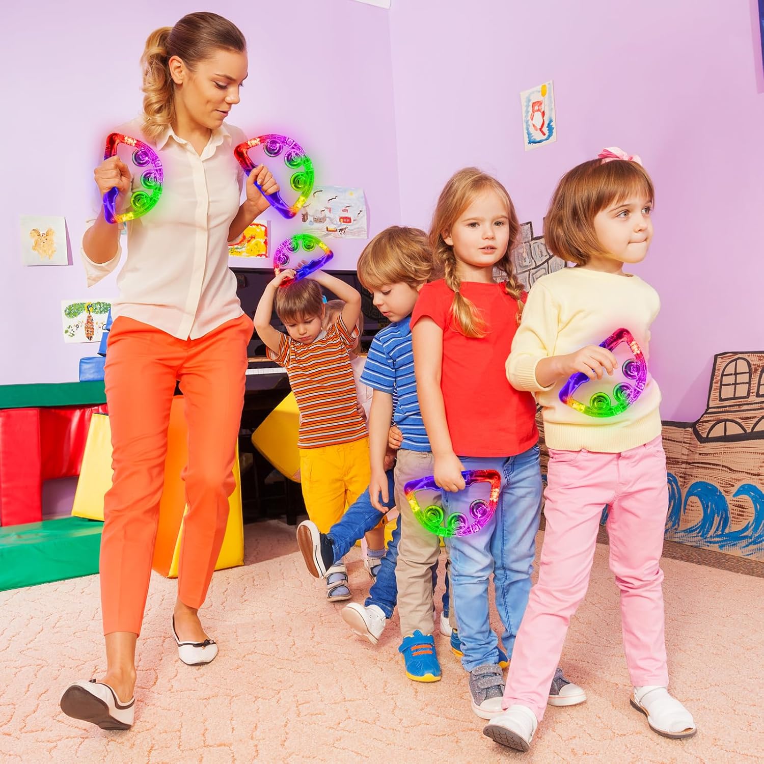 - 3 FLASHING MODES LIGHT UP MUSICAL TOYS - LED tambourine Built-in 3 lighting modes, including fast flashing, slow flashing, and alternately flashing, you can choose the flashing mode you want according to your preference or the current atmosphere. LED light up tambourine is absolutely indispensable toy to liven up the party atmosphere, and it will be a hit at your party.
